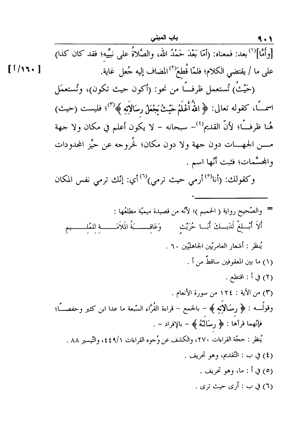 (حَيْثُ) تُستعمل ظرفًا من نحو: (أكون حيث تكون) ، وتُستعمَل اسمًا، كقوله تعالى: {اللهُ أَعْلَمُ حَيْثُ يَجْعَلُ رِسَالاَتِهِ} 3؛ فليست (حيث) هُنا ظرفًا؛ لأنّ القديم4- سبحانه - لا يكون أعلم في مكان ولا جهة من الجهات دون جهة ولا دون مكان؛ لخُروجه عن حيِّز المحدودات والمجسَّمات؛ فثبت أنّها اسم.