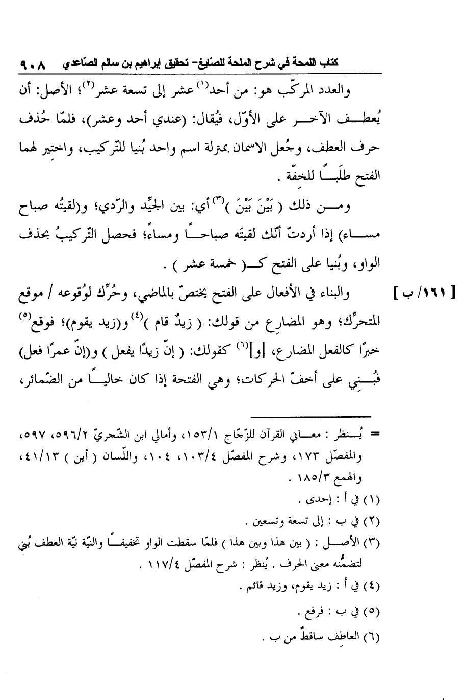 ومن ذلك (بَيْنَ بَيْنَ) 3 أي: بين الجيِّد والرّدي؛ و (لقيتُه صباح مساء) إذا أردتّ أنّك لقيتَه صباحًا ومساءً؛ فحصل التّركيبُ بحذف الواو، وبُنيا على الفتح كـ (خمسة عشر) .