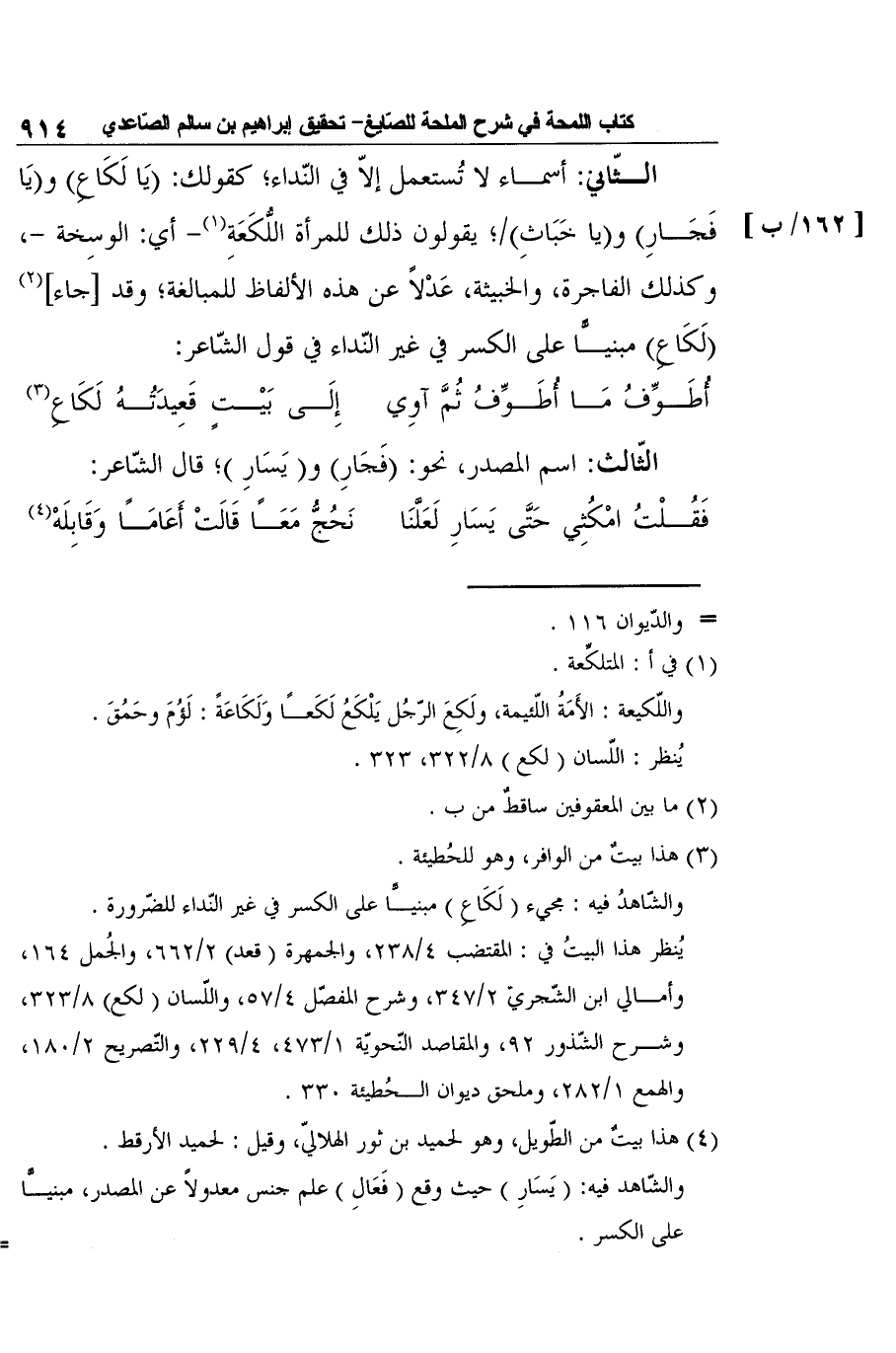 الثّاني: أسماء لا تُستعمل إلاّ في النّداء؛ كقولك: (يَا لَكَاعِ) و (يَا فَجَارِ) و (يا خَبَاثِ) ؛ يقولون ذلك للمرأة اللُّكَعَةِ1- أي: الوسِخة -، وكذلك الفاجرة، والخبيثة، عَدْلاً عن هذه الألفاظ للمبالغة؛ وقد [جاء] 2 (لَكَاعِ) مبنيًّا على الكسر في غير النّداء في قول الشّاعر: [162/ب]