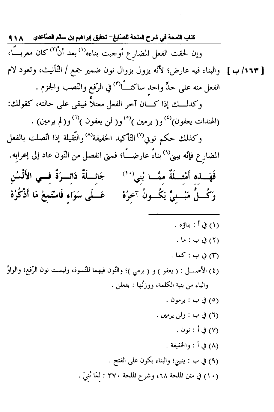 10 في متن الملحة 68، وشرح الملحة 370: لِمَا بُنِيَ.
