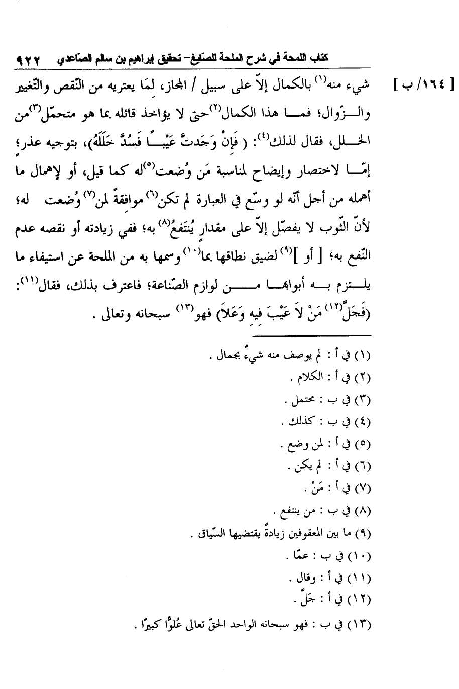 شيء منه1 بالكمال إلاّ على سبيل [164/ب] المجاز، لِمَا يعتريه من النّقص والتّغيير والزّوال؛ فما هذا الكمال2حتى لا يؤاخذ قائله بما هو متحمّل3من الخلل، فقال لذلك4: (فَإِنْ وَجَدتَّ عَيْبًا فَسُدَّ خَلَلَهُ) ، بتوجيه عذر؛ ٍ إمّا لاختصار وإيضاح لمناسبة مَن وُضعت5له كما قيل، أو لإهمال ما أهمله من أجل أنّه لو وسّع في العبارة لم تكن6 موافِقةً لمن7 وُضعت له؛ لأنّ الثّوب لا يفصّل إلاّ على مقدارٍ يُنتَفعُ8 به؛ ففي زيادته أو نقصه عدم النّفع به؛ [أو] 9 لضيق نطاقها بما10 وسمها به من الملحة عن استيفاء ما يلتزم به أبوابها من لوازم الصّناعة؛ فاعترف بذلك، فقال11: (فَجَلَّ12 مَنْ لاَ عَيْبَ فِيهِ وَعَلاَ) فهو13 سبحانه وتعالى.