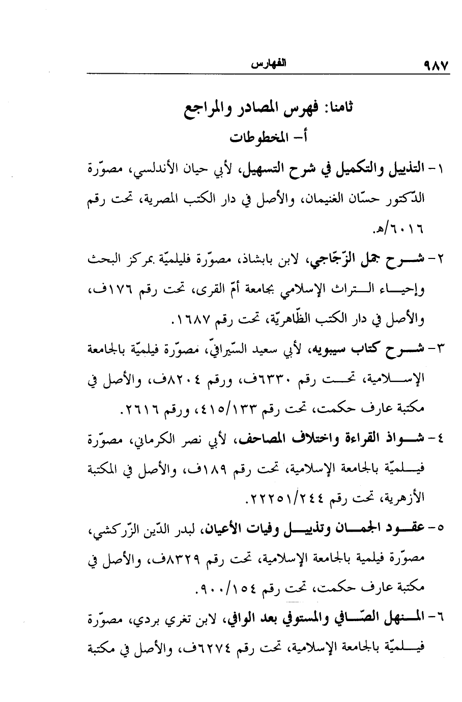 1- التذييل والتكميل في شرح التسهيل، لأبي حيان الأندلسي، مصوّرة الدّكتور حسّان الغنيمان، والأصل في دار الكتب المصرية، تحت رقم 6016/هـ.