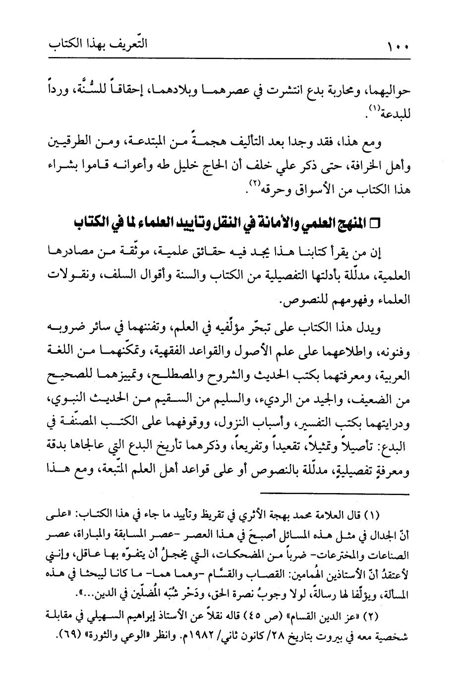 ومع هذا، فقد وجدا بعد التأليف هجمةً من المبتدعة، ومن الطرقيين وأهل الخرافة، حتى ذكر علي خلف أن الحاج خليل طه وأعوانه قاموا بشراء هذا الكتاب من الأسواق وحرقه (¬2) .