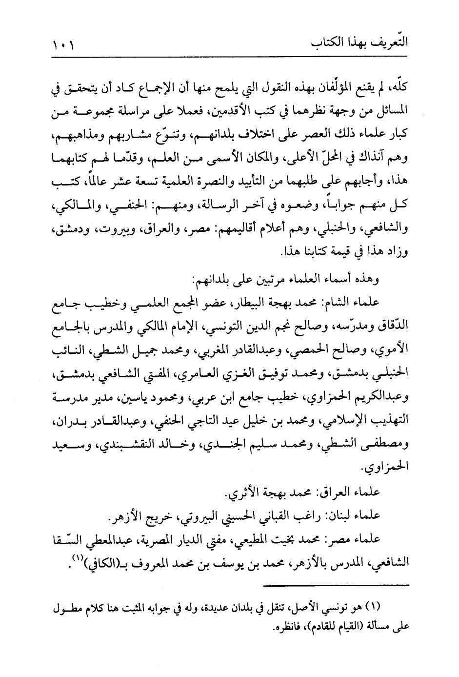 كلّه، لم يقنع المؤلِّفان بهذه النقول التي يلمح منها أن الإجماع كاد أن يتحقق في المسائل من وجهة نظرهما في كتب الأقدمين، فعملا على مراسلة مجموعة من كبار علماء ذلك العصر على اختلاف بلدانهم، وتنوّع مشاربهم ومذاهبهم، وهم آنذاك في المحلّ الأعلى، والمكان الأسمى من العلم، وقدّما لهم كتابهما هذا، وأجابهم على طلبهما من التأييد والنصرة العلمية تسعة عشر عالماً، كتب كل منهم جواباً، وضعوه في آخر الرسالة، ومنهم: الحنفي، والمالكي، والشافعي، والحنبلي، وهم أعلام أقاليمهم: مصر، والعراق، وبيروت، ودمشق، وزاد هذا في قيمة كتابنا هذا.