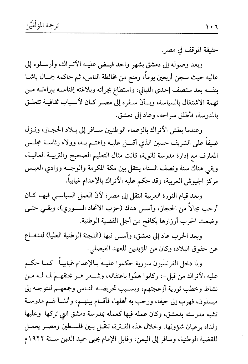 وعندما بطش الأتراك بالزعماء الوطنيين سافر إلى بلاد الحجاز، ونزل ضيفاً على الشريف حسين الذي أقبل عليه واهتم به، وولاه رئاسة مجلس المعارف مع إدارة مدرسة ثانوية، كانت مثال التعليم الصحيح والتربية العالية، وبقي هناك سنة ونصف السنة، ينتقل بين مكة المكرمة والوجه ووادي العيس مركز الجيوش العربية، وقد حكم عليه الأتراك بالإعدام غيابياً.