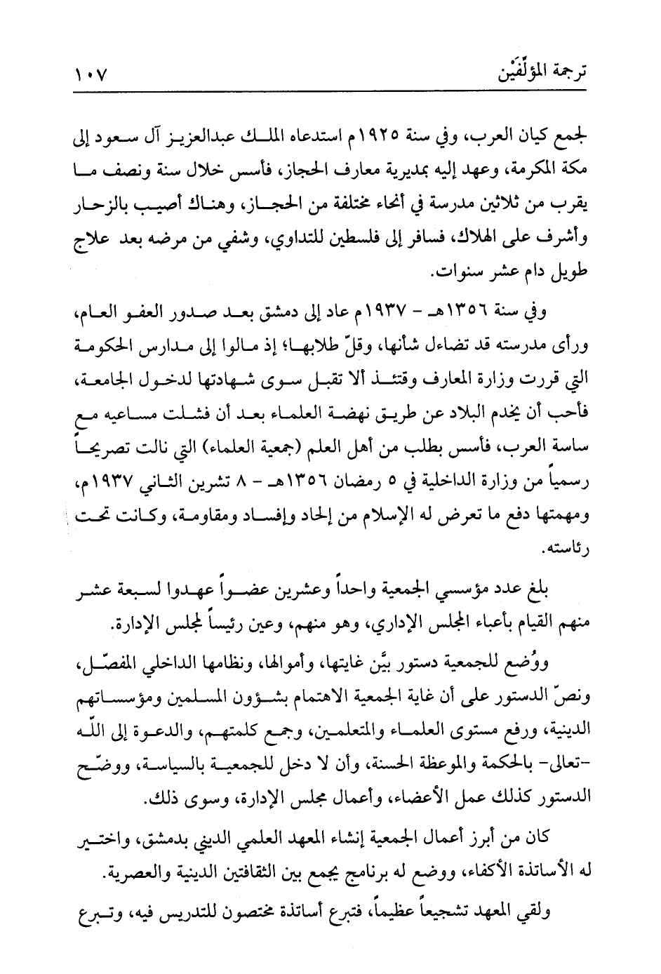 وفي سنة 1356هـ - 1937م عاد إلى دمشق بعد صدور العفو العام، ورأى مدرسته قد تضاءل شأنها، وقلّ طلابها؛ إذ مالوا إلى مدارس الحكومة التي قررت وزارة المعارف وقتئذ ألا تقبل سوى شهادتها لدخول الجامعة، فأحب أن يخدم البلاد عن طريق نهضة العلماء بعد أن فشلت مساعيه مع ساسة العرب، فأسس بطلب من أهل العلم (جمعية العلماء) التي نالت تصريحاً رسمياً من وزارة الداخلية في 5 رمضان 1356هـ - 8 تشرين الثاني 1937م، ومهمتها دفع ما تعرض له الإسلام من إلحاد وإفساد ومقاومة، وكانت تحت رئاسته.