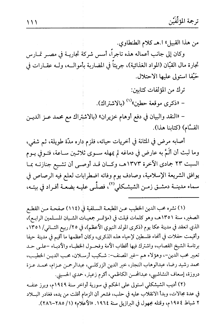 (¬2) أديب الشيشكلي استولى على الحكم في سورية أواخر سنة 1949م، وبرز عنفه في عدة مجالات، وبدأ الانقلاب عليه في حلب، فشعر أن الزمام أفلت من يده، فغادر البلاد 2 شباط 1954م، وقتله مجهول في البرازيل سنة 1964. «الأعلام» (1/285-286) .