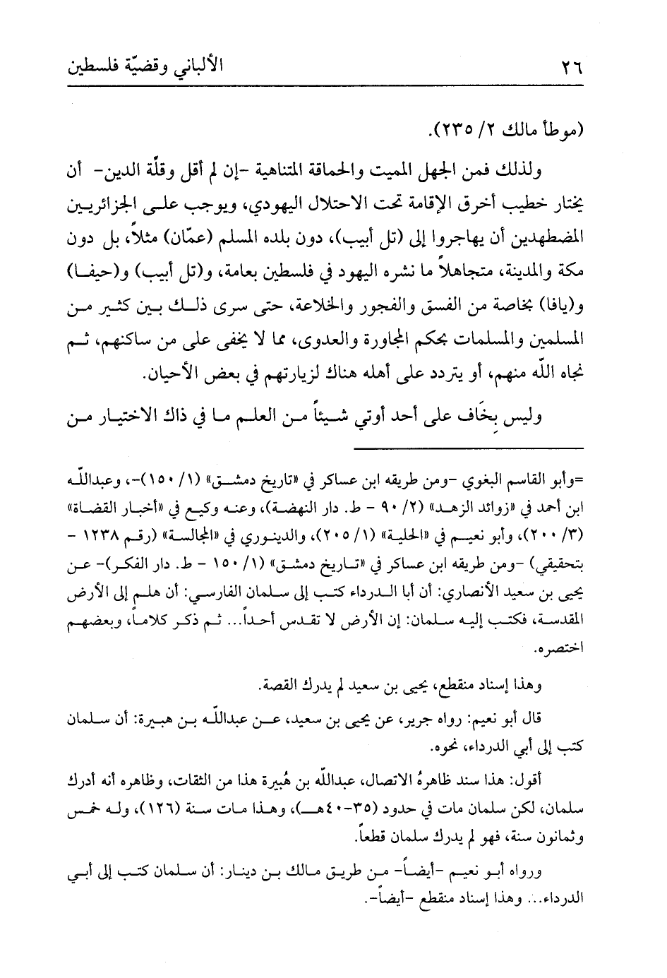 ولذلك فمن الجهل المميت والحماقة المتناهية -إن لم أقل وقلِّة الدين- أن يختار خطيب أخرق الإقامة تحت الاحتلال اليهودي، ويوجب على الجزائريين المضطهدين أن يهاجروا إلى (تل أبيب) ، دون بلده المسلم (عمّان) مثلاً، بل دون مكة والمدينة، متجاهلاً ما نشره اليهود في فلسطين بعامة، و (تل أبيب) و (حيفا) و (يافا) بخاصة من الفسق والفجور والخلاعة، حتى سرى ذلك بين كثير من المسلمين والمسلمات بحكم المجاورة والعدوى، مما لا يخفى على من ساكنهم، ثم نجاه الله منهم، أو يتردد على أهله هناك لزيارتهم في بعض الأحيان.