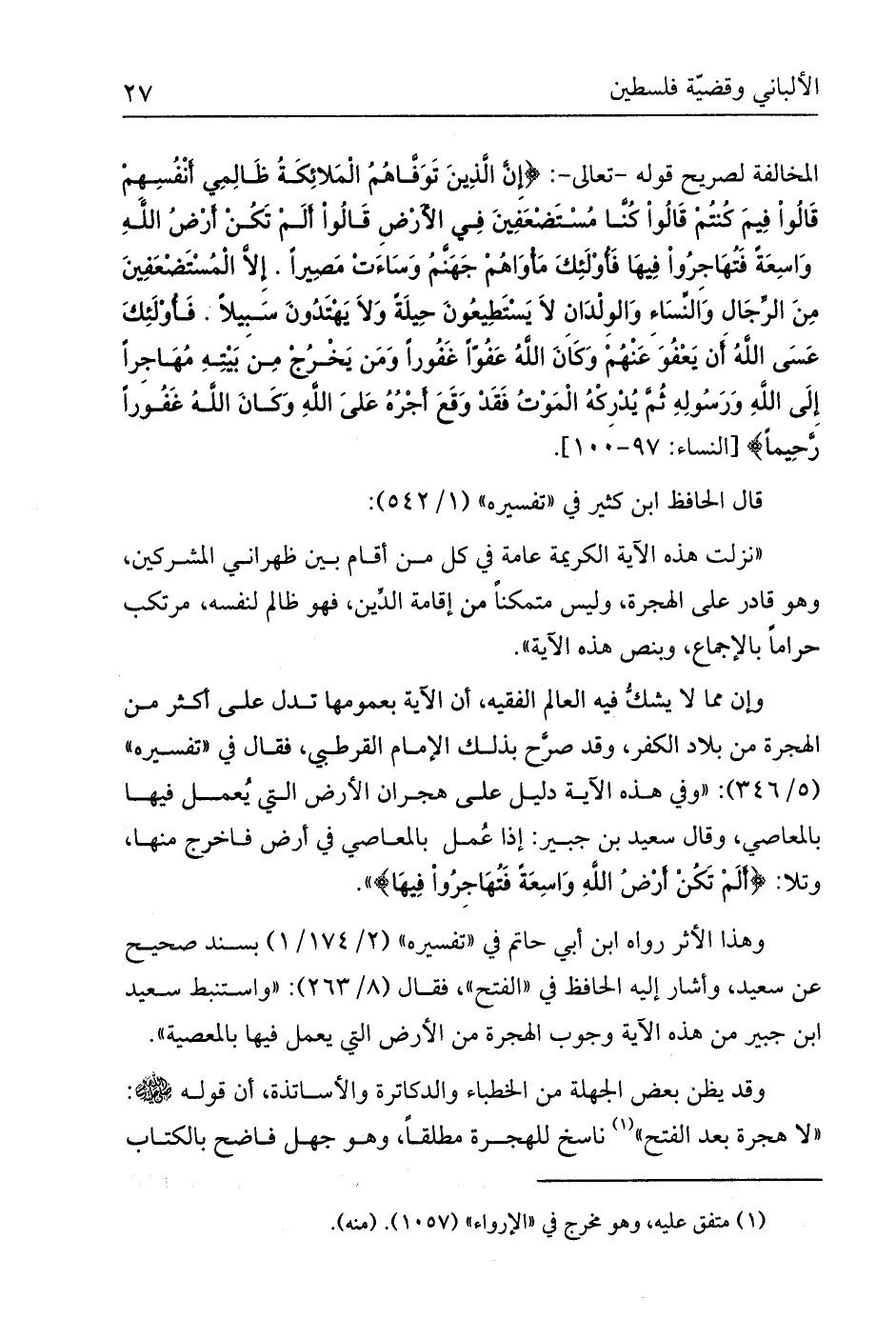 المخالفة لصريح قوله -تعالى-: {إِنَّ الَّذِينَ تَوَفَّاهُمُ الْمَلائِكَةُ ظَالِمِي أَنْفُسِهِمْ قَالُواْ فِيمَ كُنتُمْ قَالُواْ كُنَّا مُسْتَضْعَفِينَ فِي الأَرْضِ قَالُواْ أَلَمْ تَكُنْ أَرْضُ اللَّهِ وَاسِعَةً فَتُهَاجِرُواْ فِيهَا فَأُوْلَئِكَ مَأْوَاهُمْ جَهَنَّمُ وَسَاءَتْ مَصِيراً. إِلاَّ الْمُسْتَضْعَفِينَ مِنَ الرِّجَالِ وَالنِّسَاءِ وَالوِلْدَانِ لاَ يَسْتَطِيعُونَ حِيلَةً وَلاَ يَهْتَدُونَ سَبِيلاً. فَأُوْلَئِكَ عَسَى اللَّهُ أَن يَعْفُوَ عَنْهُمْ وَكَانَ اللَّهُ عَفُوّاً غَفُوراً وَمَن يَخْرُجْ مِن بَيْتِهِ مُهَاجِراً إِلَى اللَّهِ وَرَسُولِهِ ثُمَّ يُدْرِكْهُ الْمَوْتُ فَقَدْ وَقَعَ أَجْرُهُ عَلىَ اللَّهِ وَكَانَ اللَّهُ غَفُوراً رَّحِيماً} [النساء: 97-100] .