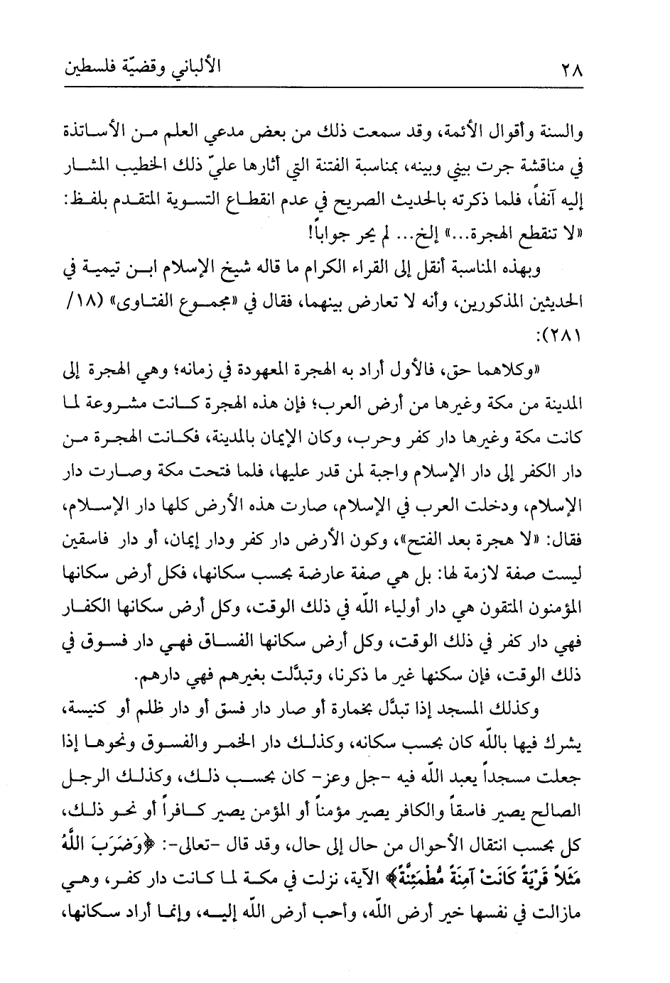 والسنة وأقوال الأئمة، وقد سمعت ذلك من بعض مدعي العلم من الأساتذة في مناقشة جرت بيني وبينه، بمناسبة الفتنة التي أثارها عليّ ذلك الخطيب المشار إليه آنفاً، فلما ذكرته بالحديث الصريح في عدم انقطاع التسوية المتقدم بلفظ: «لا تنقطع الهجرة ... » إلخ ... لم يحر جواباً!