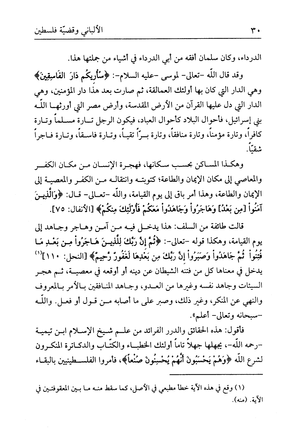 فأقول: هذه الحقائق والدرر الفرائد من علم شيخ الإسلام ابن تيمية -رحمه الله-، يجهلها جهلاً تاماً أولئك الخطباء والكتّاب والدكاترة المنكرون لشرع الله {وَهُمْ يَحْسَبُونَ أَنَّهُمْ يُحْسِنُونَ صُنْعاً} ، فأمروا الفلسطينيين بالبقاء