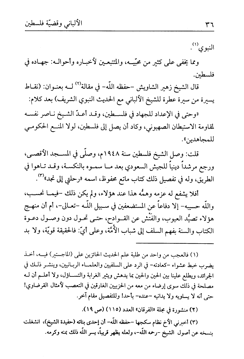 قلت: وصل الشيخ فلسطين سنة 1948م، وصلّى في المسجد الأقصى، ورجع مرشداً دينياً للجيش السعودي بعد ما سموه بالنكسة، وقد تاهوا في الطريق، وله في تفصيل ذلك كتاب ماتع محفوظ، اسمه «رحلتي إلى نجد» (¬3) .