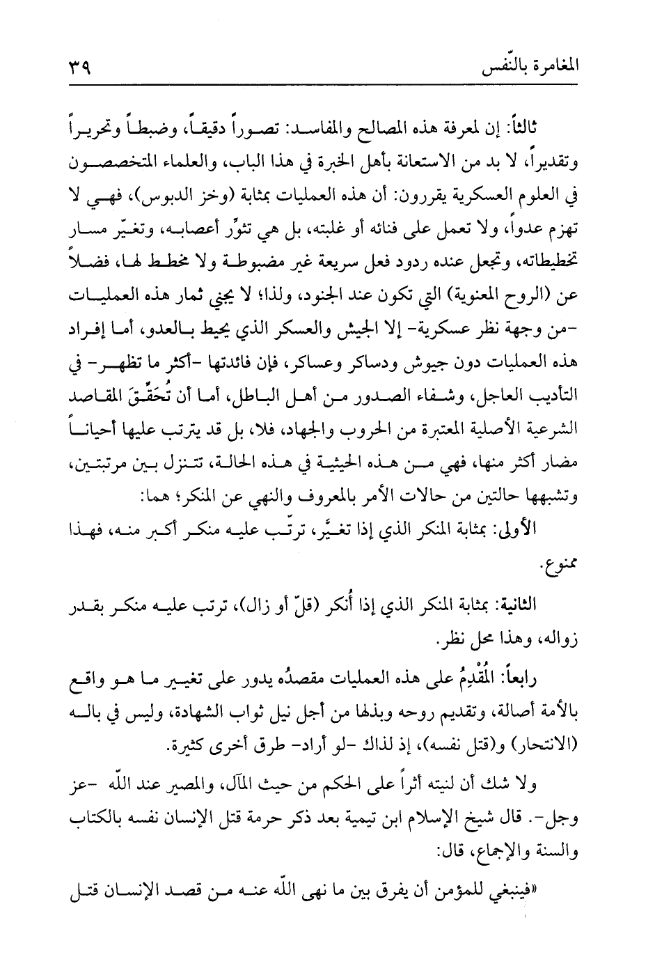 ثالثاً: إن لمعرفة هذه المصالح والمفاسد: تصوراً دقيقاً، وضبطاً وتحريراً وتقديراً، لا بد من الاستعانة بأهل الخبرة في هذا الباب، والعلماء المتخصصون في العلوم العسكرية يقررون: أن هذه العمليات بمثابة (وخز الدبوس) ، فهي لا تهزم عدواً، ولا تعمل على فنائه أو غلبته، بل هي تثوِّر أعصابه، وتغيّر مسار تخطيطاته، وتجعل عنده ردود فعل سريعة غير مضبوطة ولا مخطط لها، فضلاً عن (الروح المعنوية) التي تكون عند الجنود، ولذا؛ لا يجني ثمار هذه العمليات -من وجهة نظر عسكرية- إلا الجيش والعسكر الذي يحيط بالعدو، أما إفراد هذه العمليات دون جيوش ودساكر وعساكر، فإن فائدتها -أكثر ما تظهر- في التأديب العاجل، وشفاء الصدور من أهل الباطل، أما أن تُحَقِّقَ المقاصد الشرعية الأصلية المعتبرة من الحروب والجهاد، فلا، بل قد يترتب عليها أحياناً مضار أكثر منها، فهي من هذه الحيثية في هذه الحالة، تتنزل بين مرتبتين، وتشبهها حالتين من حالات الأمر بالمعروف والنهي عن المنكر؛ هما: