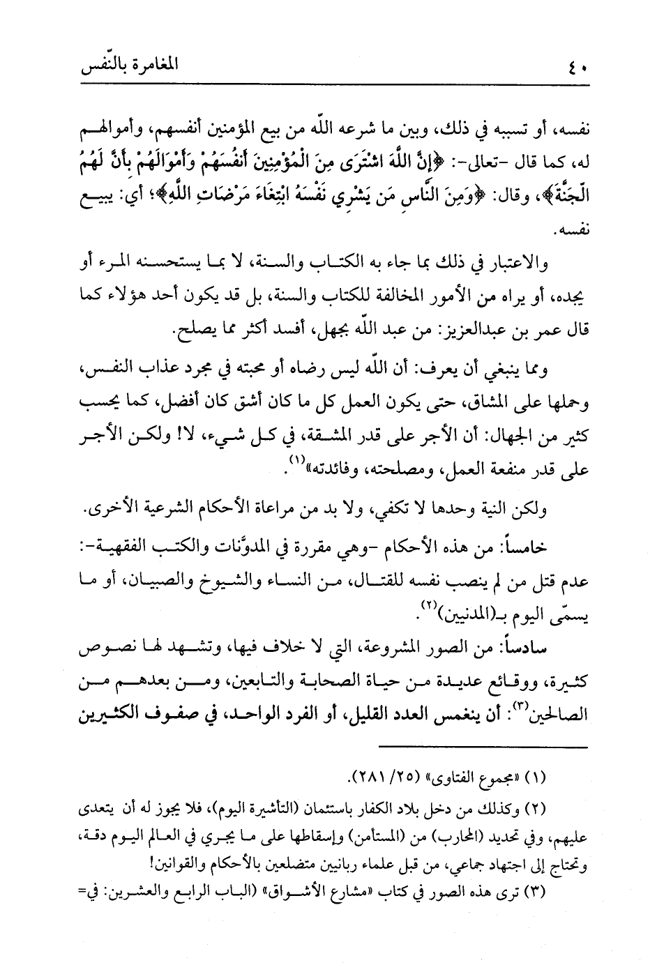 (¬3) ترى هذه الصور في كتاب «مشارع الأشواق» (الباب الرابع والعشرين: في= =فضل انغماس الرجل الشجاع أو الجماعة القليلة في العدو الكثير رغبة في الشهادة) (2/522-564 - ط. دار البشائر) ، وأورد أدلة كثيرة على مشروعية ذلك، تنظر فيه، فالمقام هنا ليس مقام بسط. وجل من صنف في هذه المسألة تكثر بهذه الأمثلة -وهي مكررة-!