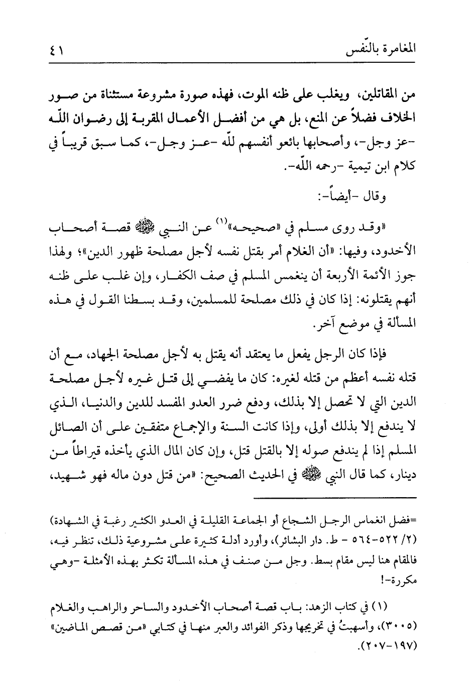 «وقد روى مسلم في «صحيحه» (¬1) عن النبي s قصة أصحاب الأخدود، وفيها: «أن الغلام أمر بقتل نفسه لأجل مصلحة ظهور الدين» ؛ ولهذا جوز الأئمة الأربعة أن ينغمس المسلم في صف الكفار، وإن غلب على ظنه أنهم يقتلونه: إذا كان في ذلك مصلحة للمسلمين، وقد بسطنا القول في هذه المسألة في موضع آخر.