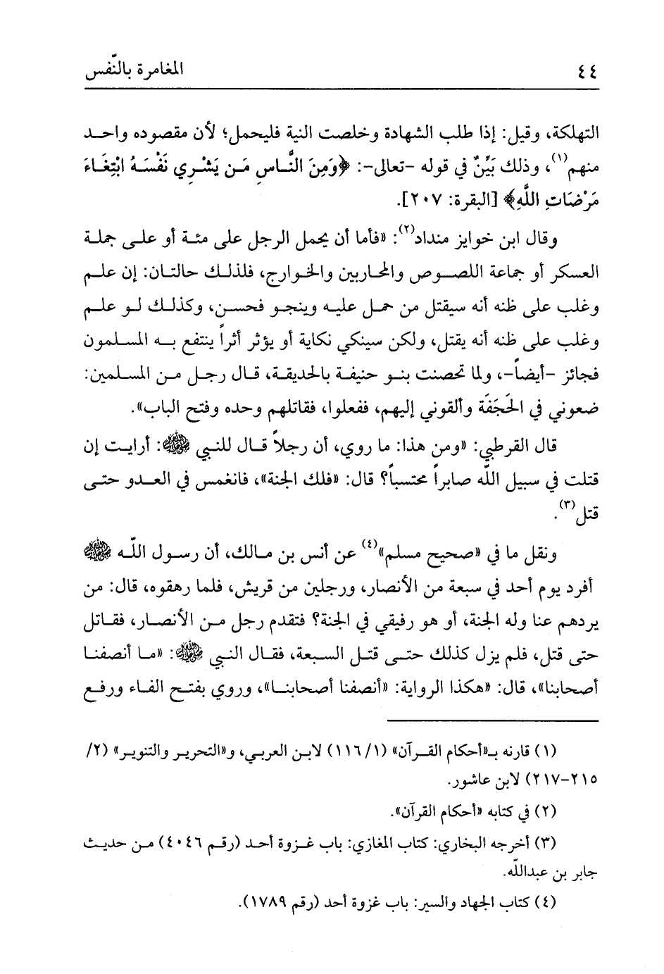 التهلكة، وقيل: إذا طلب الشهادة وخلصت النية فليحمل؛ لأن مقصوده واحد منهم (¬1) ، وذلك بَيِّنٌ في قوله -تعالى-: {وَمِنَ النَّاسِ مَن يَشْرِي نَفْسَهُ ابْتِغَاءَ مَرْضَاتِ اللَّهِ} [البقرة: 207] .