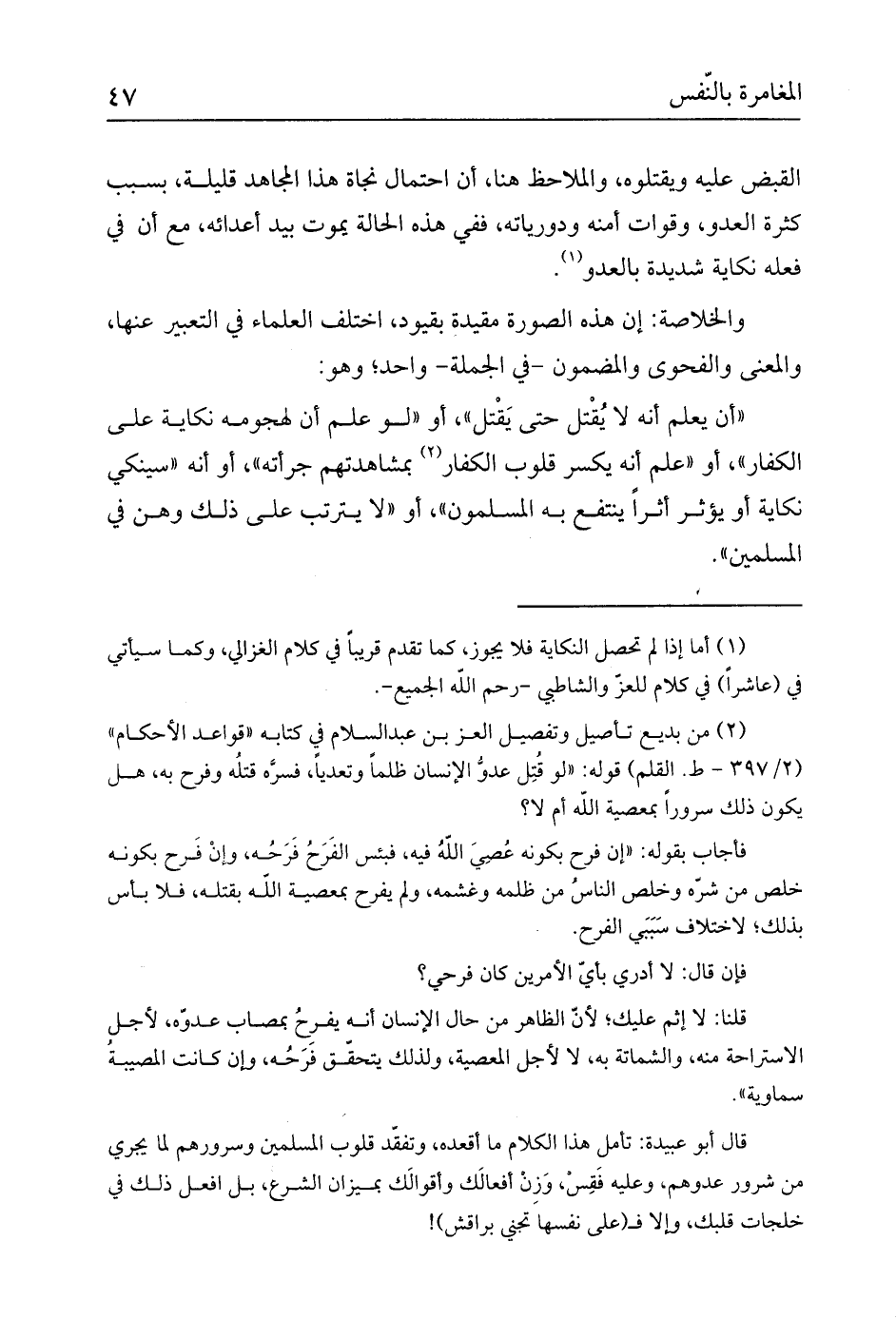 (¬1) أما إذا لم تحصل النكاية فلا يجوز، كما تقدم قريباً في كلام الغزالي، وكما سيأتي في (عاشراً) في كلام للعزّ والشاطبي -رحم الله الجميع-.