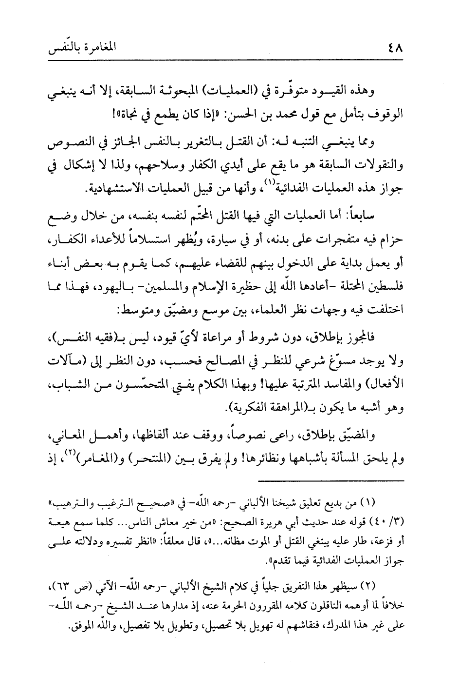 والمضيّق بإطلاق، راعى نصوصاً، ووقف عند ألفاظها، وأهمل المعاني، ولم يلحق المسألة بأشباهها ونظائرها! ولم يفرق بين (المنتحر) و (المغامر) (¬2) ، إذ