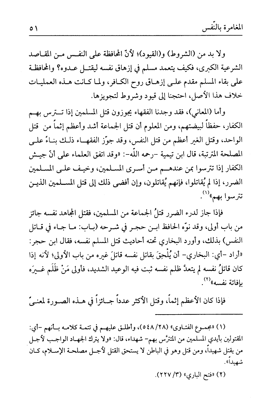 فإذا جاز لدرء الضرر قتلُ الجماعة من المسلمين، فقتل المجاهد نفسه جائز من باب أولى، وقد نوّه الحافظ ابن حجر في شرحه (باب: ما جاء في قاتل النفس) بذلك، وأورد البخاري تحته أحاديث قتل المسلم نفسه، فقال ابن حجر: «أراد -أي: البخاري- أن يُلْحِقَ بقاتل نفسه قاتلَ غيره من باب الأولى؛ لأنه إذا كان قاتلُ نفسه لم يتعدَّ ظلم نفسه ثبت فيه الوعيد الشديد، فأولى مَنْ ظَلَم غيرَه بإفاتة نفسه» (¬2) .