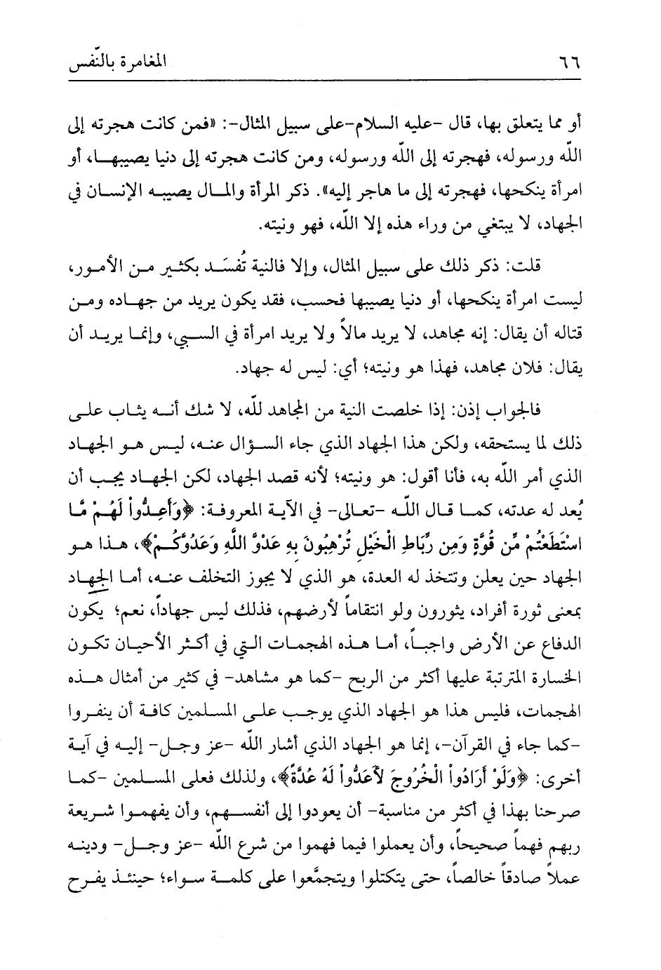أو مما يتعلق بها، قال -عليه السلام-على سبيل المثال-: «فمن كانت هجرته إلى الله ورسوله، فهجرته إلى الله ورسوله، ومن كانت هجرته إلى دنيا يصيبها، أو امرأة ينكحها، فهجرته إلى ما هاجر إليه» . ذكر المرأة والمال يصيبه الإنسان في الجهاد، لا يبتغي من وراء هذه إلا الله، فهو ونيته.