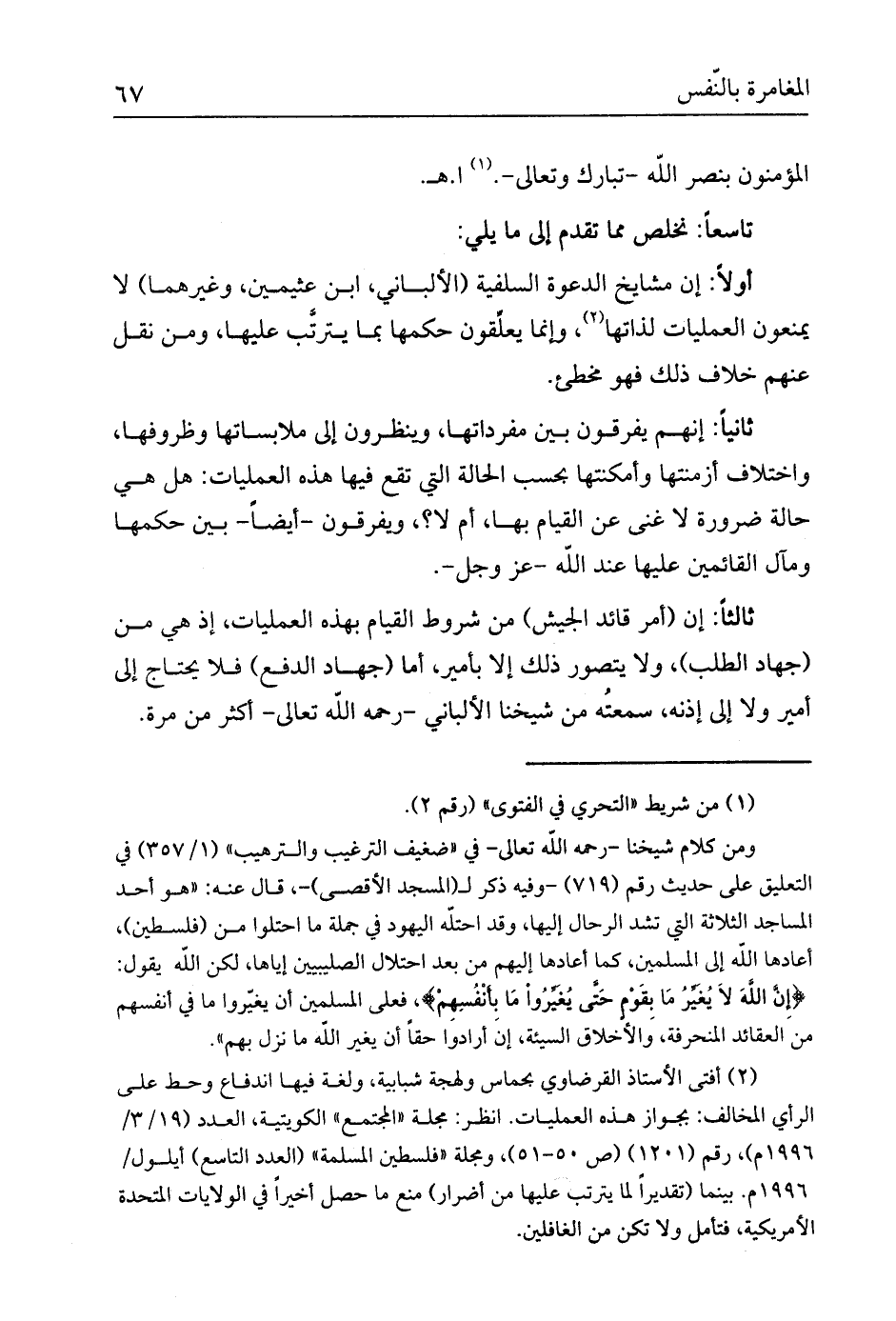 أولاً: إن مشايخ الدعوة السلفية (الألباني، ابن عثيمين، وغيرهما) لا يمنعون العمليات لذاتها (¬2) ، وإنما يعلِّقون حكمها بما يترتَّب عليها، ومن نقل عنهم خلاف ذلك فهو مخطئ.