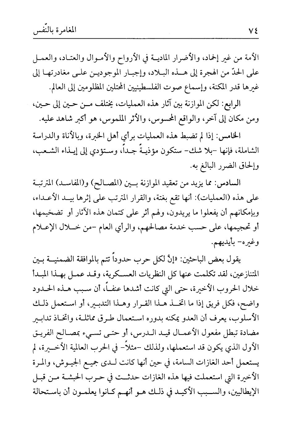 السادس: مما يزيد من تعقيد الموازنة بين (المصالح) و (المفاسد) المترتبة على هذه (العمليات) : أنها تقع بغتة، والقرار المترتب على إثرها بيد الأعداء، وبإمكانهم أن يفعلوا ما يريدون، ولهم أثر على كتمان هذه الآثار أو تضخيمها، أو تحجيمها، على حسب خدمة مصالحهم، والرأي العام -من خلال الإعلام وغيره- بأيديهم.