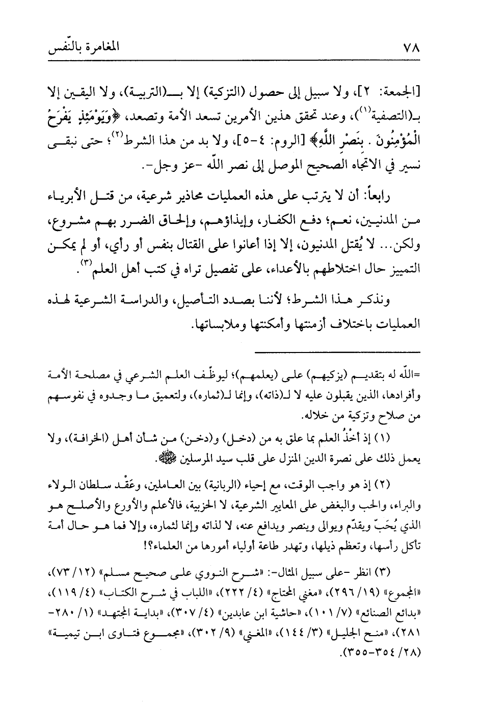 رابعاً: أن لا يترتب على هذه العمليات محاذير شرعية، من قتل الأبرياء من المدنيين، نعم؛ دفع الكفار، وإيذاؤهم، وإلحاق الضرر بهم مشروع، ولكن ... لا يُقتل المدنيون، إلا إذا أعانوا على القتال بنفس أو رأي، أو لم يمكن التمييز حال اختلاطهم بالأعداء، على تفصيل تراه في كتب أهل العلم (¬3) .