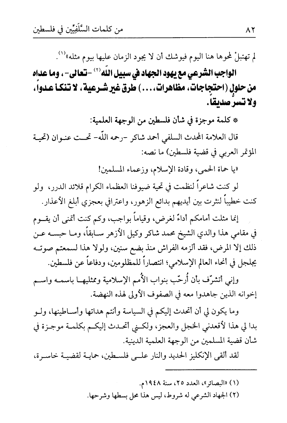 قال العلامة المحدث السلفي أحمد شاكر -رحمه الله- تحت عنوان (تحية المؤتمر العربي في قضية فلسطين) ما نصه: