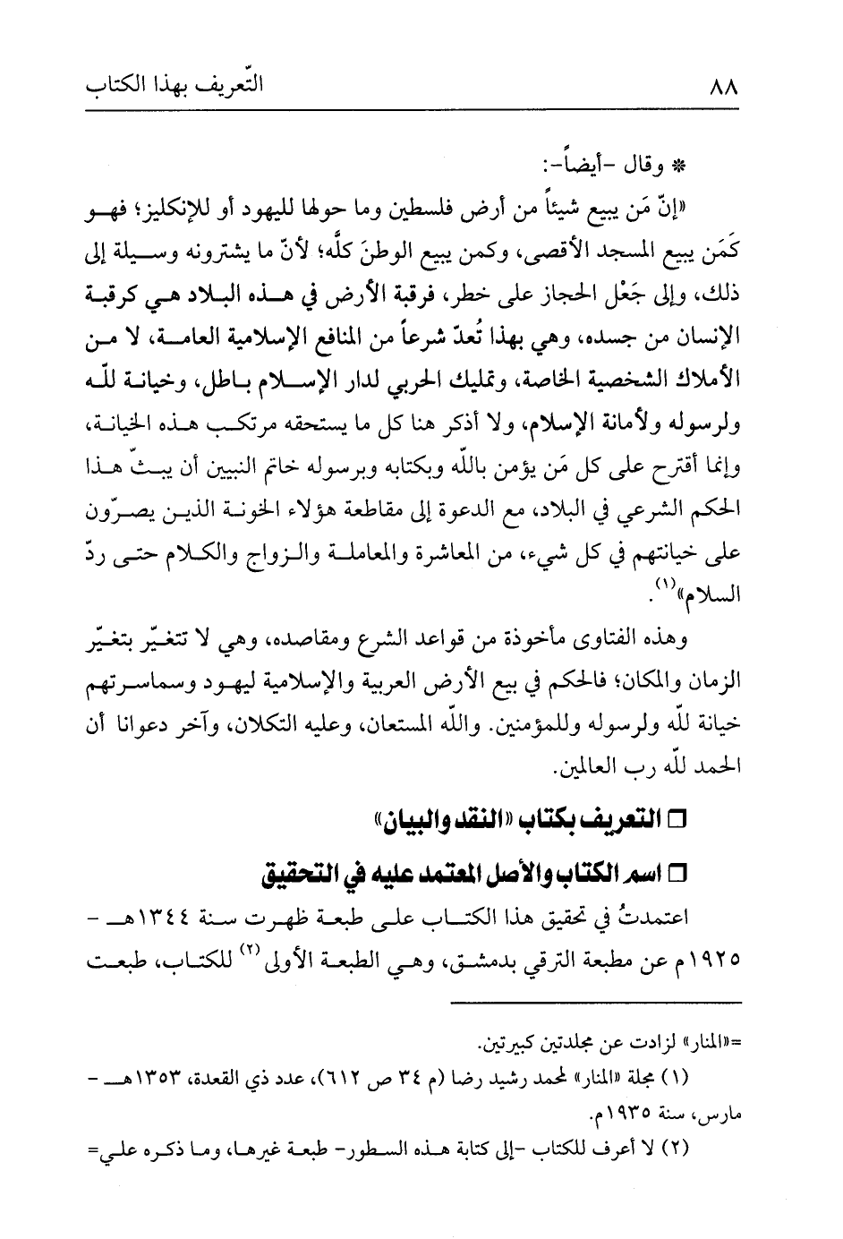 (¬2) لا أعرف للكتاب -إلى كتابة هذه السطور- طبعة غيرها، وما ذكره علي= =حسين خلف في كتابه «عز الدين القسام» (ص 45) أن الكتاب طبع بعنوان «النقد والبيان في رد أوامر خزيران» عن طريق مكتبة محمود يوسف عيسى الصفدي، غير دقيق، إذ اعتمد فيما دوّن على مقابلات شخصية، وضبط العنوان والناشر -ولا سيما مع مضي الزمان- يعتريه الوهم والنسيان!