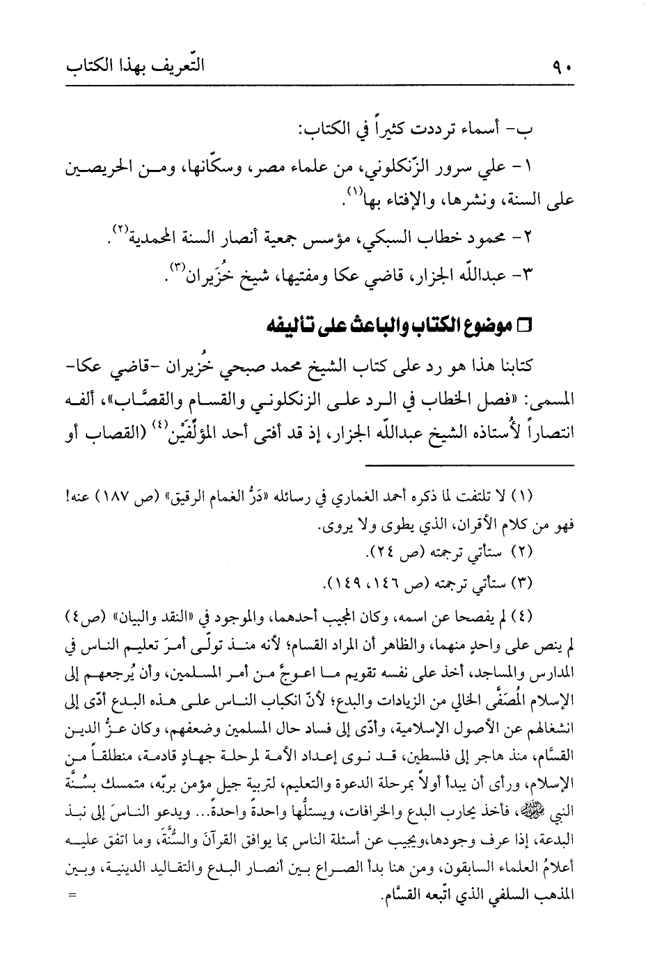 كتابنا هذا هو رد على كتاب الشيخ محمد صبحي خُزيران -قاضي عكا- المسمى: «فصل الخطاب في الرد على الزنكلوني والقسام ... والقصَّاب» ، ألفه انتصاراً لأُستاذه الشيخ عبد الله الجزار، إذ قد أفتى أحد المؤلِّفَيْن (¬4)