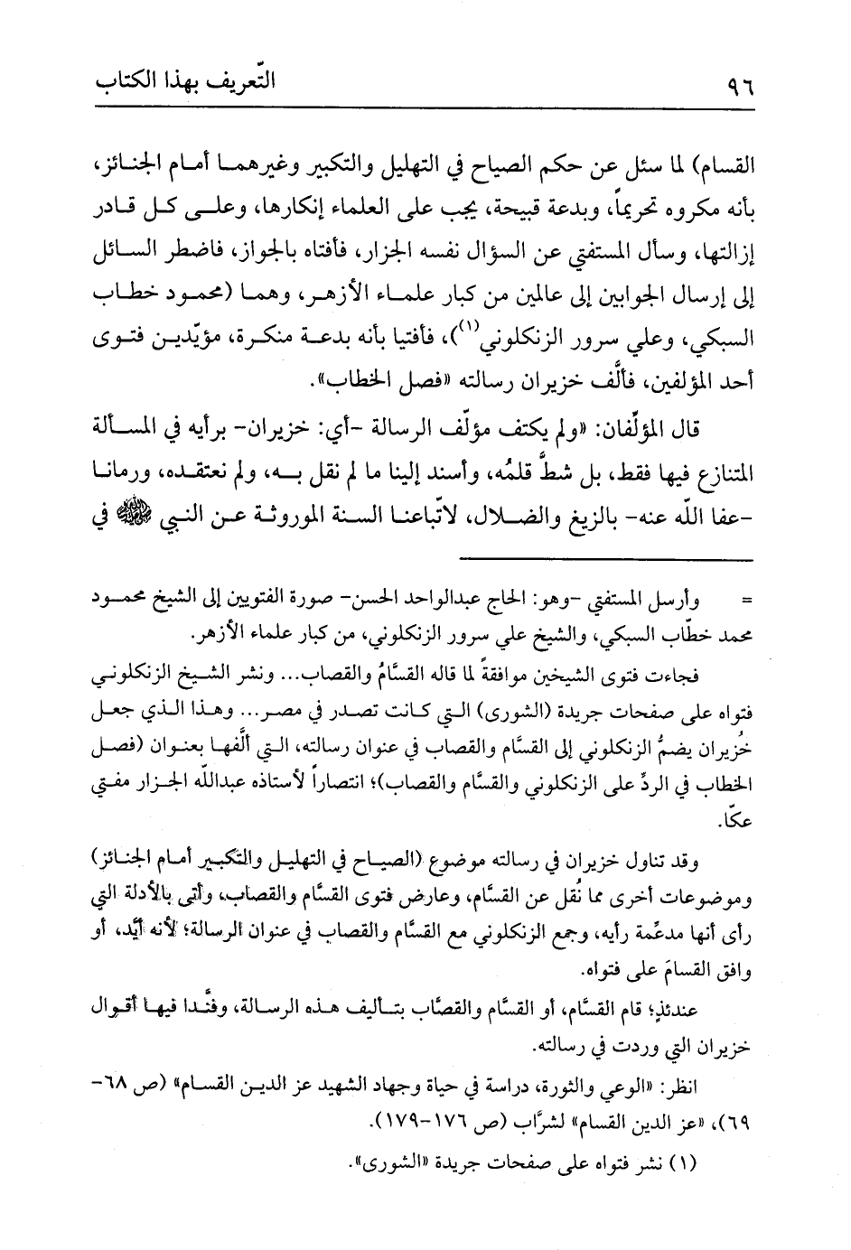 القسام) لما سئل عن حكم الصياح في التهليل والتكبير وغيرهما أمام الجنائز، بأنه مكروه تحريماً، وبدعة قبيحة، يجب على العلماء إنكارها، وعلى كل قادر إزالتها، وسأل المستفتي عن السؤال نفسه الجزار، فأفتاه بالجواز، فاضطر السائل إلى إرسال الجوابين إلى عالمين من كبار علماء الأزهر، وهما (محمود خطاب السبكي، وعلي سرور الزنكلوني (¬1)) ، فأفتيا بأنه بدعة منكرة، مؤيّدين فتوى أحد المؤلفين، فألَّف خزيران رسالته «فصل الخطاب» .