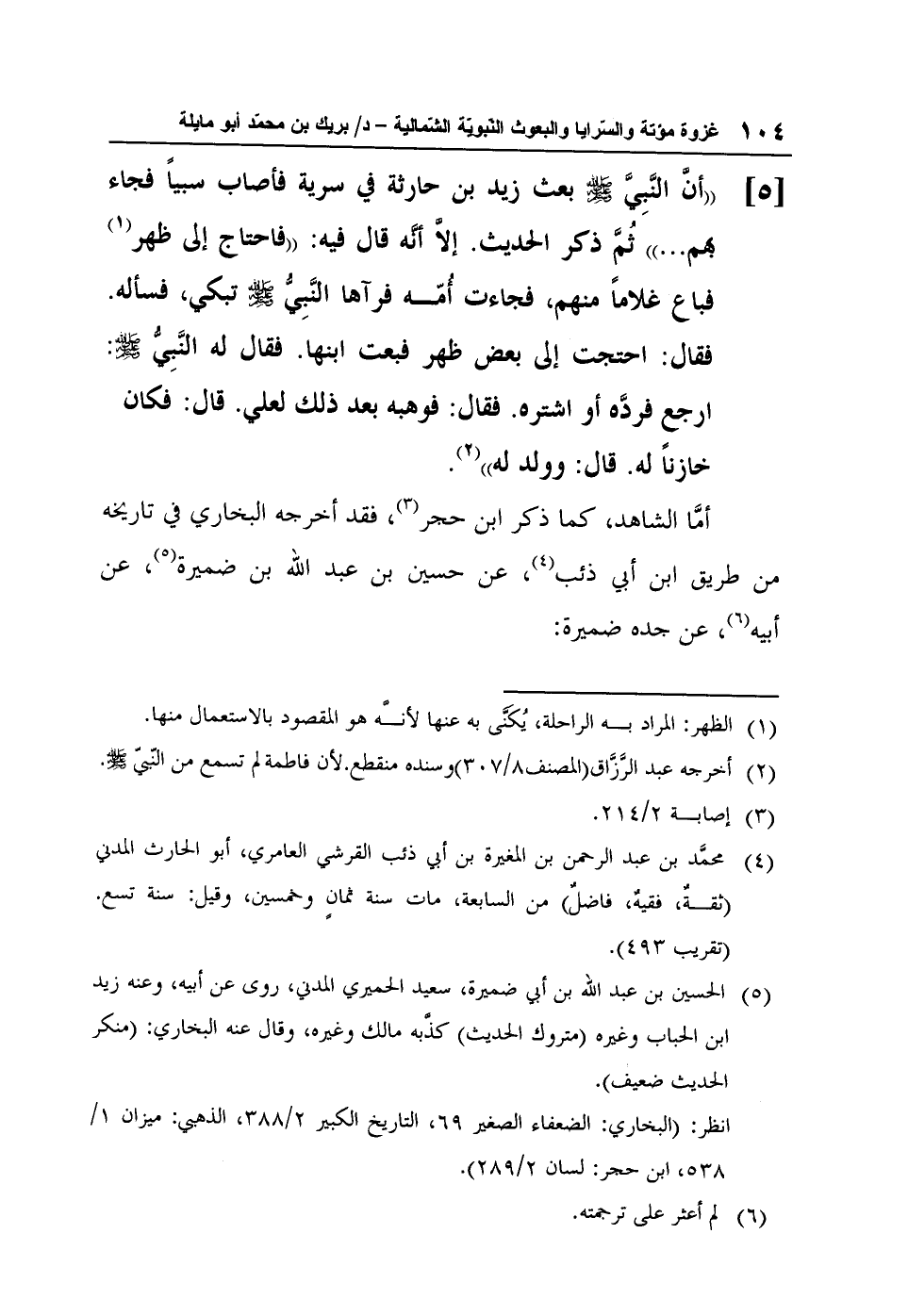 [5] "أنَّ النَّبِيَّ صلى الله عليه وسلم بعث زيد بن حارثة في سرية فأصاب سبياً فجاء بهم" ... ثُمَّ ذكر الحديث". إلاَّ أنَّه قال فيه: ""فاحتاج إلى ظهر1 فباع غلاماً منهم، فجاءت أُمّه فرآها النَّبِيُّ صلى الله عليه وسلم تبكي، فسأله". فقال: "احتجت إلى بعض ظهر فبعت ابنها". فقال له النَّبِيُّ صلى الله عليه وسلم: "ارجع فردَّه أو اشتره". فقال: "فوهبه بعد ذلك لعلي". قال: "فكان خازناً له". قال: "وولد له"2".