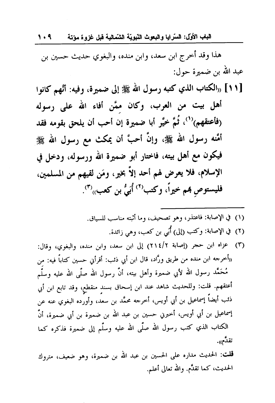 3 عزاه ابن حجر (إصابة 2/214) إلى ابن سعد، وابن منده، والبغوي، وقال: ((أخرجه ابن منده من طريق ورَّاد، قال ابن أبي ذئب: أقرأني حسين كتاباً فيه: مِن مُحَمَّد رسول الله لأبي ضميرة وأهل بيته، أنَّ رسول الله صلَّى الله عليه وسلَّم أعتقهم. قلت: وللحديث شاهد عند ابن إسحاق بسندٍ منقطعٍ، وقد تابع ابن أبي ذئب أيضاً إسماعيل بن أبي أويس، أخرجه محمَّد بن سعد، وأورده البغوي عنه عن إسماعيل بن أبي أويس، أخبرني حسين بن عبد الله بن ضميرة بن أبي ضميرة، أنَّ الكتاب الذي كتب رسول الله صلَّى الله عليه وسلَّم إلى ضميرة فذكره كما تقدَّم".