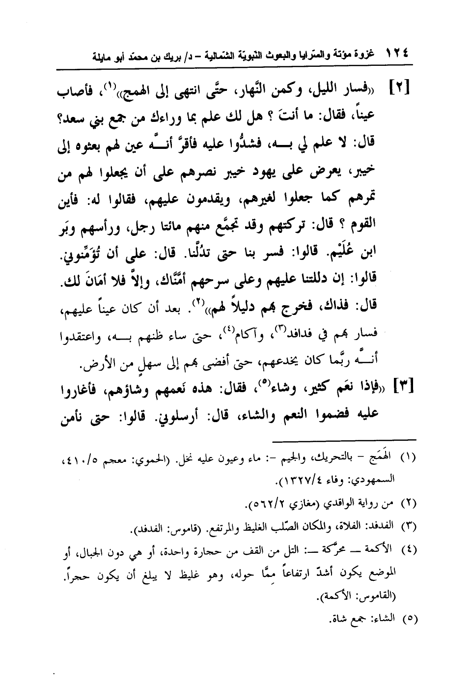 [2] "فسار الليل، وكمن النَّهار، حتَّى انتهى إلى الهمج"1، فأصاب عيناً، فقال: "ما أنتَ؟ هل لك علم بما وراءك من جمع بني سعد؟ قال: "لا علم لي به، فشدُّوا عليه فأقرَّ أنه عين لهم بعثوه إلى خيبر، يعرض على يهود خيبر نصرهم على أن يجعلوا لهم من تمرهم كما جعلوا لغيرهم، ويقدمون عليهم، فقالوا له: "فأين القوم؟ قال: "تركتهم وقد تجمَّع منهم مائتا رجل، ورأسهم وبَر ابن عُلَيْم". قالوا: "فسر بنا حتى تدُلَّنا". قال: "على أن تُؤَمِّنوني". قالوا: "إن دللتنا عليهم وعلى سرحهم أمَّنَّاك، وإلاَّ فلا أمَانَ لك". قال: "فذاك، فخرج بهم دليلاً لهم"2". بعد أن كان عيناً عليهم، فسار بهم في فدافد3، وآكام4، حتى ساء ظنهم به، واعتقدوا أنه ربَّما كان يخدعهم، حتى أفضى بهم إلى سهلٍ من الأرض".