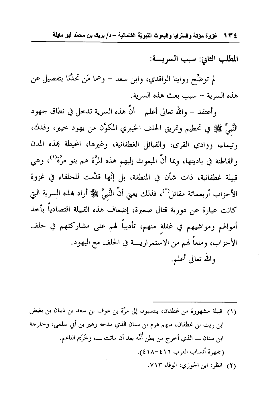 وأعتقد - والله تعالى أعلم - أنَّ هذه السرية تدخل في نطاق جهود النَّبِيِّ صلى الله عليه وسلم في تحطيم وتمزيق الحلف الخيبري المكوَّن من يهود خيبر، وفدك، وتيماء، ووادي القرى، والقبائل الغطفانية، وغيرها، المحيطة بهذه المدن والقاطنة في باديتها، وبما أنَّ المبعوث إليهم هذه المرَّة هم بنو مرَّة1، وهي قبيلة غطفانية، ذات شأن في المنطقة، بل إنَّها قدَّمت للحلفاء في غزوة الأحزاب أربعمائة مقاتل2، فذلك يعني أنَّ النَّبِيَّ صلى الله عليه وسلم أراد بهذه السرية التي كانت عبارة عن دورية قتال صغيرة، إضعاف هذه القبيلة اقتصادياً بأخذ أموالهم ومواشيهم في غفلةٍ منهم، تأديباً لهم على مشاركتهم في حلف الأحزاب، ومنعاً لهم من الاستمرارية في الحلف مع اليهود".