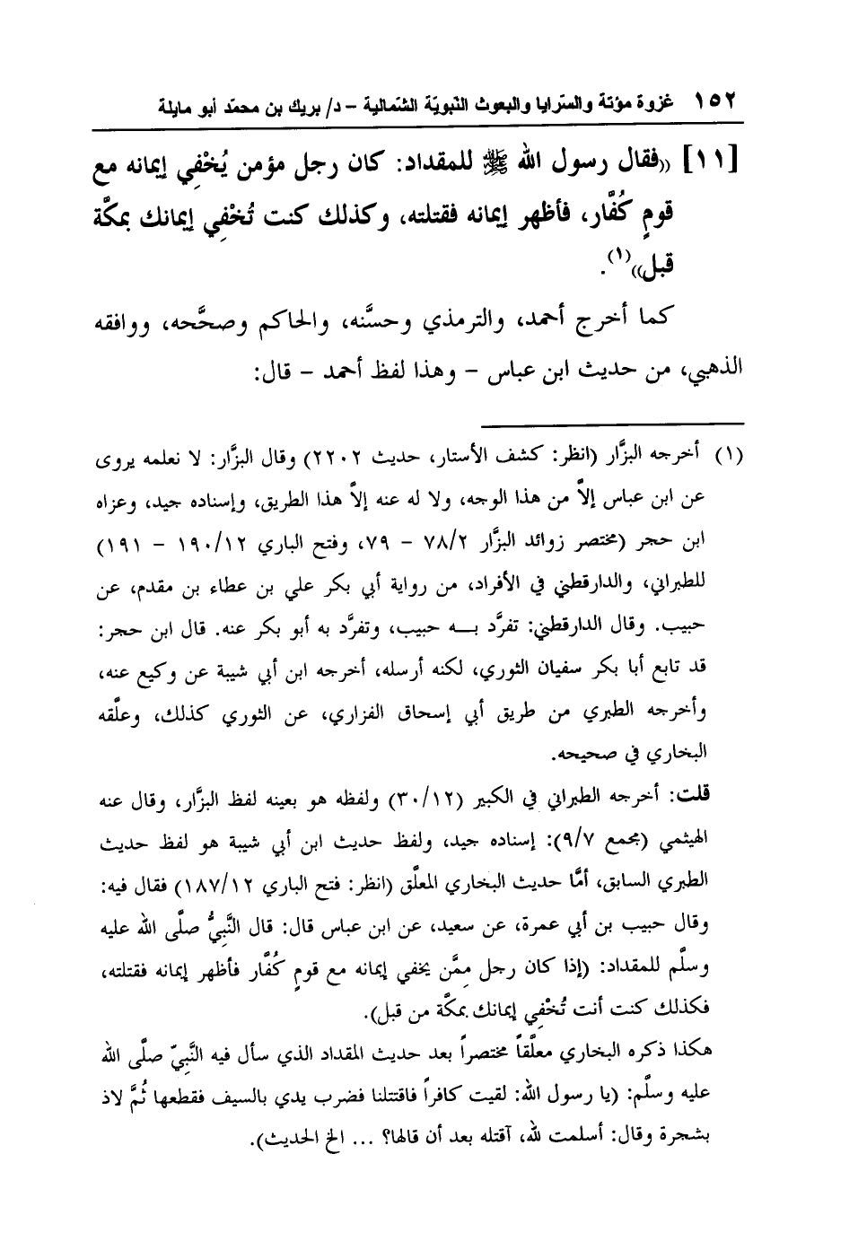 2 أخرجه الطبري (تاريخ 5/223) ، وسنده مداره على ابن إسحاق الذي عنعنه عند الطبري في روايتي سلمة، والمحاربي عنه، ولكنَّه صرَّح بالتحديث في الروايات الأخرى عند كُلٍّ من أحمد، والطبراني، وابن هشام، والبيهقي. (انظر: بريك بن محمَّد أبو مايلة: السرايا والبعوث النبوية بين مكَّة والمدينة 276) فهو حسن وإن كان الهيثمي قال عنه: رجاله ثقات.