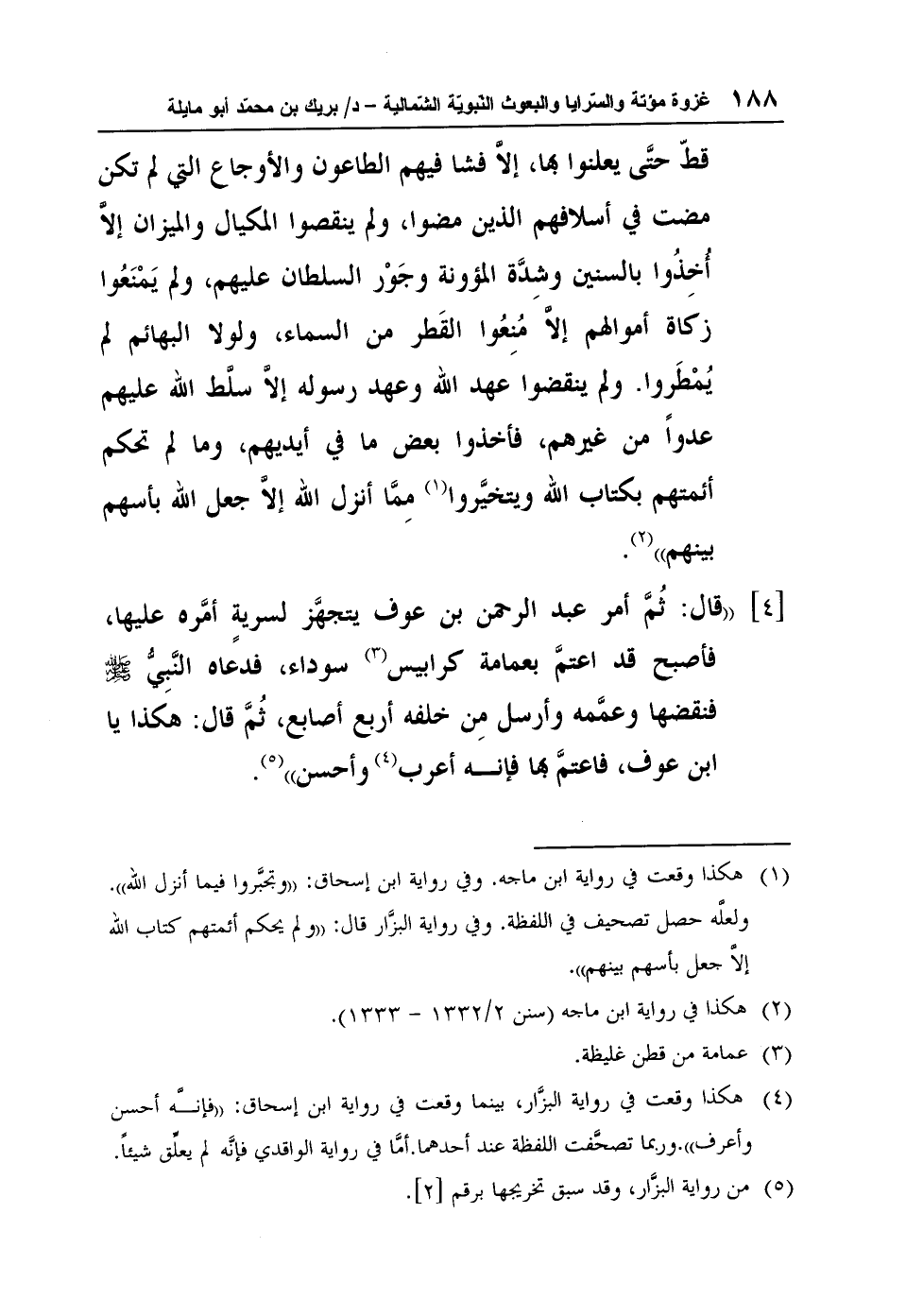 [4] "قال: "ثُمَّ أمر عبد الرحمن بن عوف يتجهَّز لسريةٍ أمَّره عليها، فأصبح قد اعتمَّ بعمامة كرابيس3 سوداء، فدعاه النَّبِيُّ صلى الله عليه وسلم فنقضها وعمَّمه وأرسل مِن خلفه أربع أصابع، ثُمَّ قال: "هكذا يا ابن عوف، فاعتمَّ بها فإنه أعرب4 وأحسن"5".