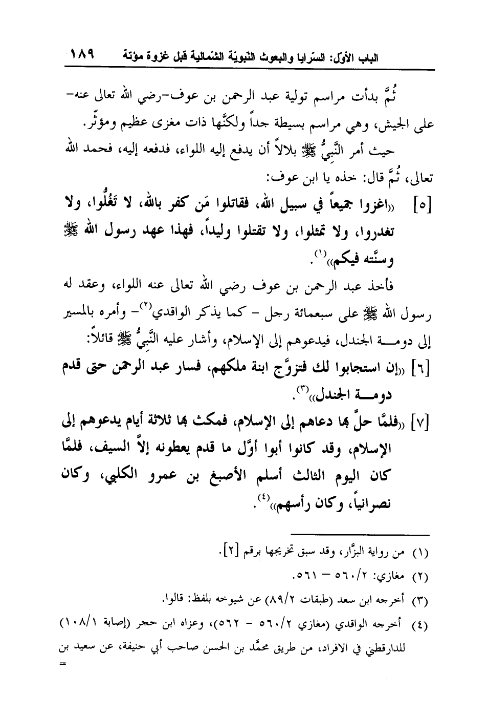 [6] "إن استجابوا لك فتزوَّج ابنة ملكهم، فسار عبد الرحمن حتى قدم دومة الجندل3".