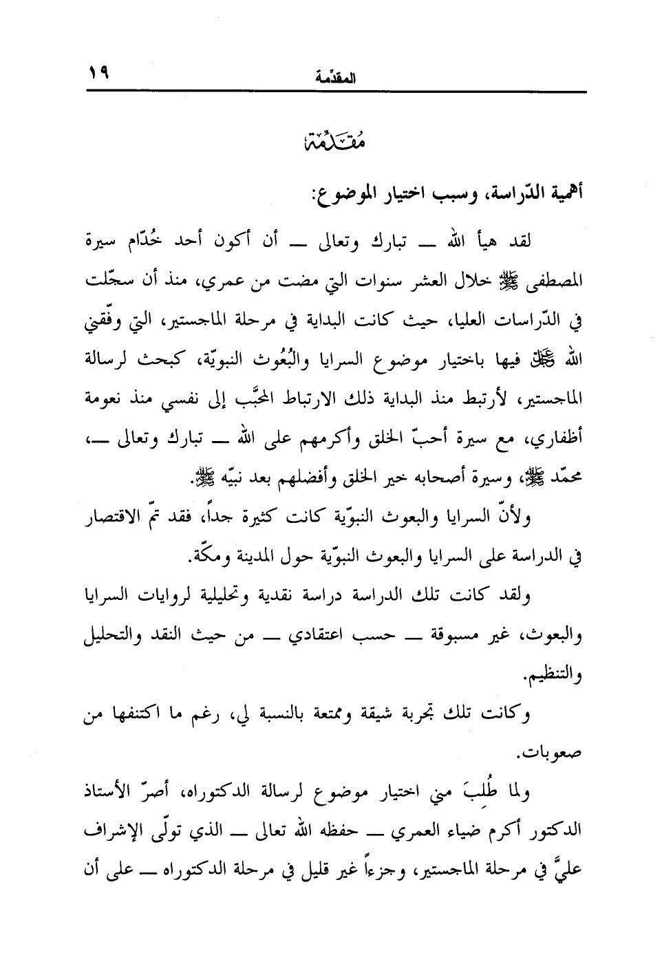 لقد هيأ الله - تبارك وتعالى - أن أكون أحد خُدّام سيرة المصطفى صلى الله عليه وسلم خلال العشر سنوات التي مضت من عمري، منذ أن سجّلت في الدّراسات العليا، حيث كانت البداية في مرحلة الماجستير، التي وفّقني الله عز وجل فيها باختيار موضوع السرايا والبُعُوث النبويّة، كبحث لرسالة الماجستير، لأرتبط منذ البداية ذلك الارتباط المحبَّب إلى نفسي منذ نعومة أظفاري، مع سيرة أحبّ الخلق وأكرمهم على الله - تبارك وتعالى -، محمّد صلى الله عليه وسلم، وسيرة أصحابه خير الخلق وأفضلهم بعد نبيّه صلى الله عليه وسلم.