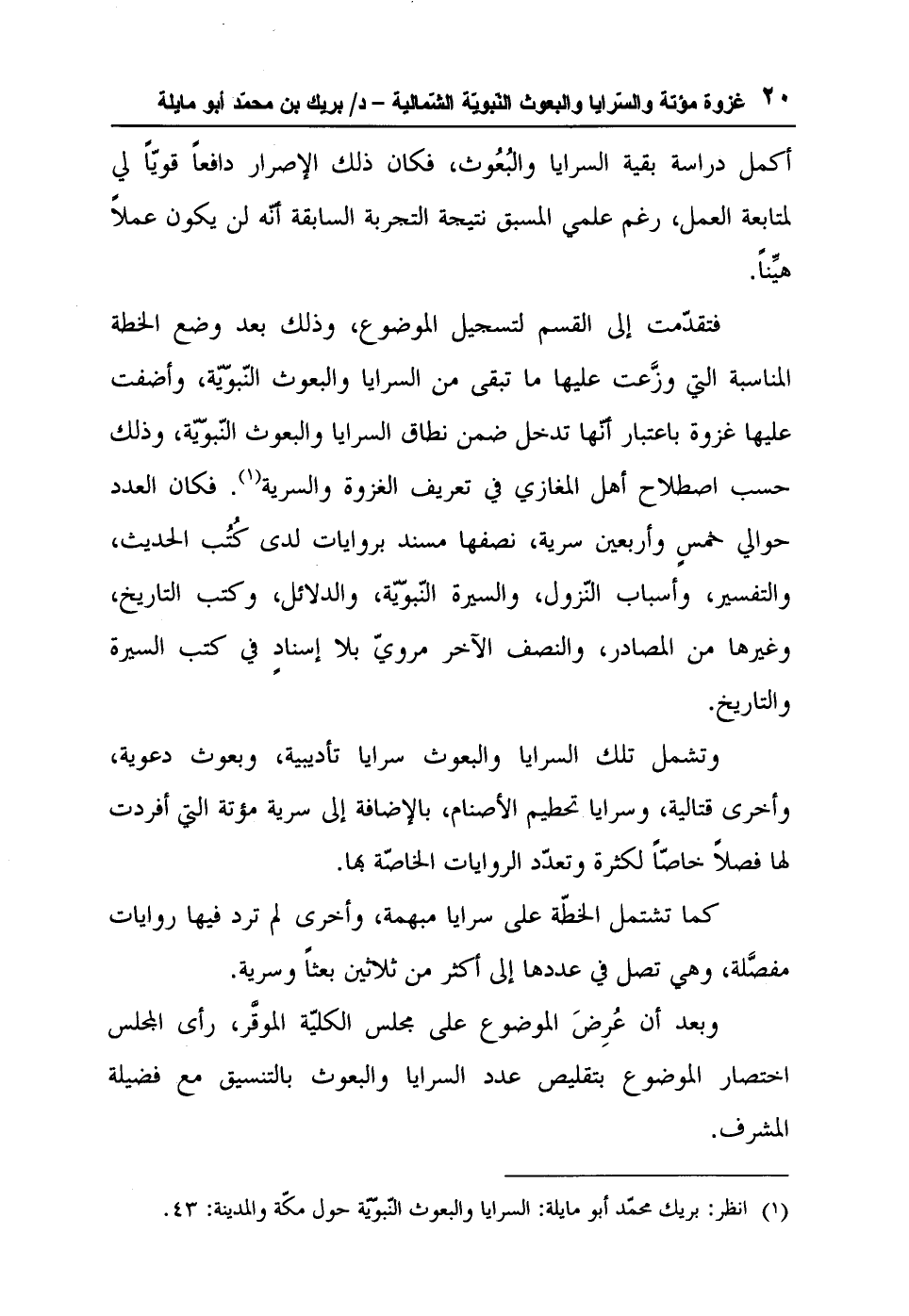 فتقدّمت إلى القسم لتسجيل الموضوع، وذلك بعد وضع الخطة المناسبة التي وزَّعت عليها ما تبقى من السرايا والبعوث النّبوّيّة، وأضفت عليها غزوة باعتبار أنّها تدخل ضمن نطاق السرايا والبعوث النّبوّيّة، وذلك حسب اصطلاح أهل المغازي في تعريف الغزوة والسرية1. فكان العدد حوالي خمسٍ وأربعين سرية، نصفها مسند بروايات لدى كُتُب الحديث، والتفسير، وأسباب النّزول، والسيرة النّبوّيّة، والدلائل، وكتب التاريخ، وغيرها من المصادر، والنصف الآخر مرويّ بلا إسنادٍ في كتب السيرة والتاريخ.