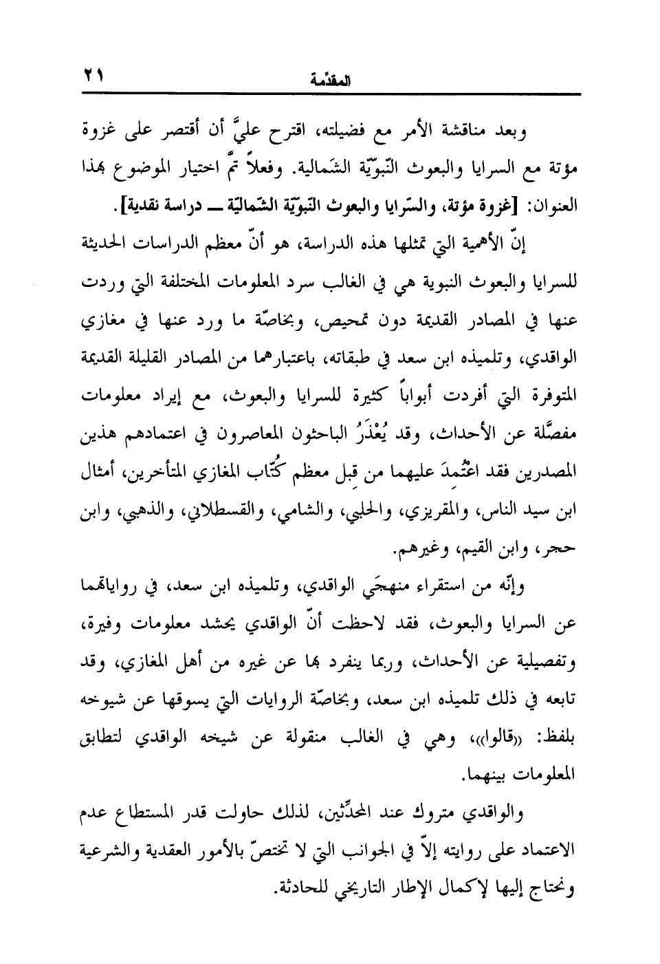 والواقدي متروك عند المحدِّثين، لذلك حاولت قدر المستطاع عدم الاعتماد على روايته إلاّ في الجوانب التي لا تختصّ بالأمور العقدية والشرعية ونحتاج إليها لإكمال الإطار التاريخي للحادثة.
