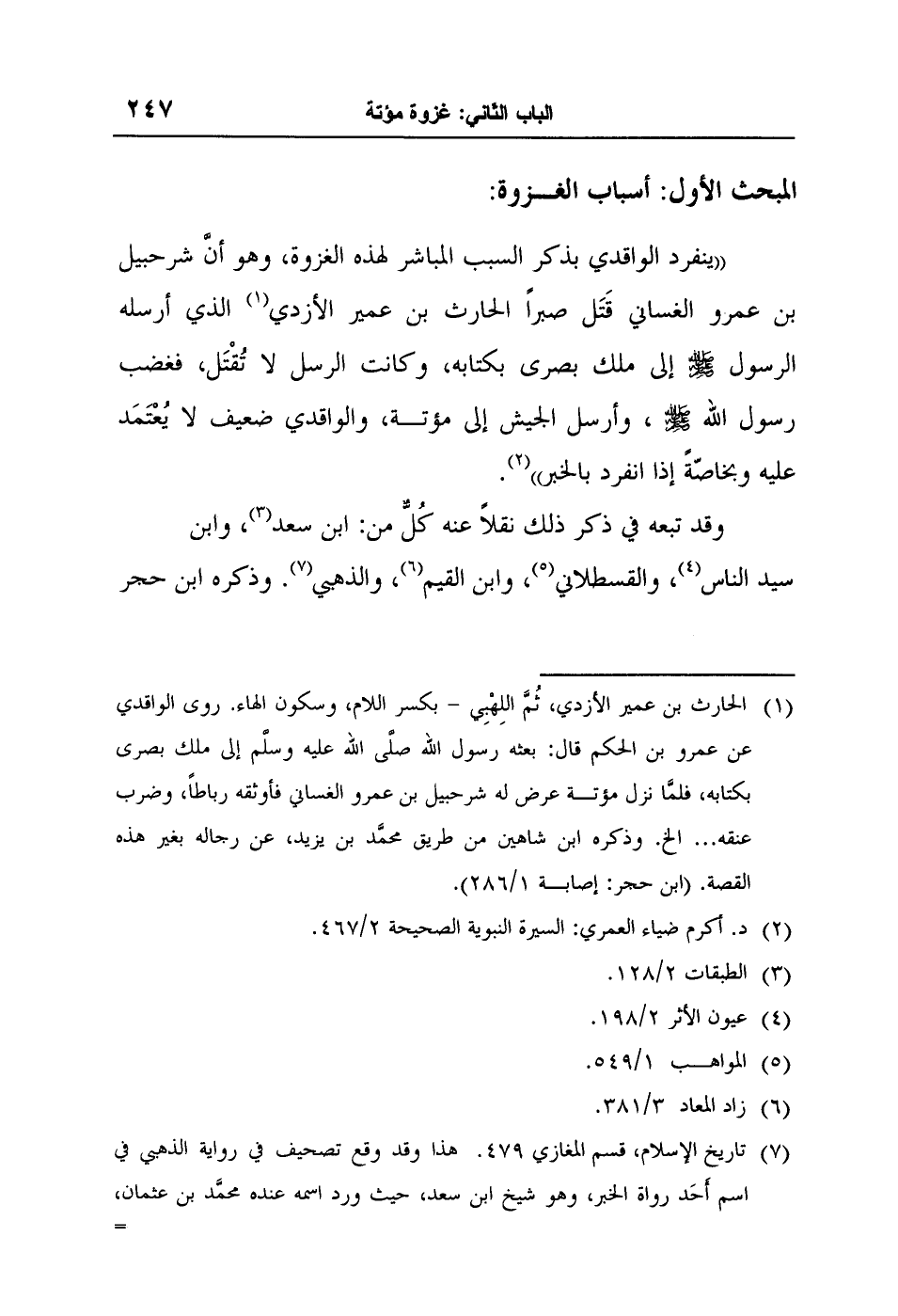 ينفرد الواقدي بذكر السبب المباشر لهذه الغزوة، وهو أنَّ شرحبيل بن عمرو الغساني قَتَل صبراً الحارث بن عمير الأزدي1 الذي أرسله الرسول صلى الله عليه وسلم إلى ملك بصرى بكتابه، وكانت الرسل لا تُقْتَل، فغضب رسول الله صلى الله عليه وسلم، وأرسل الجيش إلى مؤتة، والواقدي ضعيف لا يُعْتَمَد عليه وبخاصّةً إذا انفرد بالخبر2.