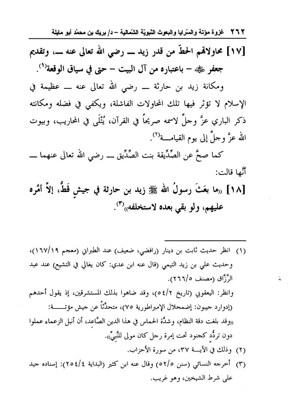 [18] "ما بعَثَ رسولُ الله صلى الله عليه وسلم زيد بن حارثة في جيشٍ قَطُّ، إلاَّ أمَّره عليهم، ولو بقي بعده لاستخلفه"3".