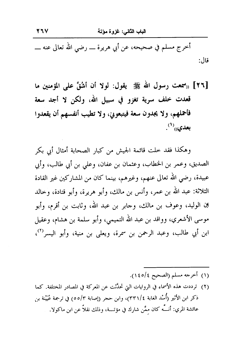 [26] "سمعت رسول الله صلى الله عليه وسلم يقول: "لولا أن أشُقَّ على المؤمنين ما قعدت خلف سرية تغزو في سبيل الله، ولكن لا أجد سعة فأحملهم، ولا يجدون سعة فيتبعوني، ولا تطيب أنفسهم أن يقعدوا بعدي"1.
