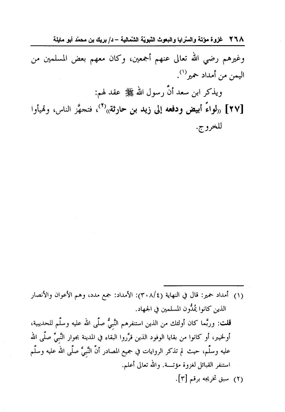 [27] "لواءً أبيض ودفعه إلى زيد بن حارثة2، فتجهَّز الناس، وتهيأوا للخروج".