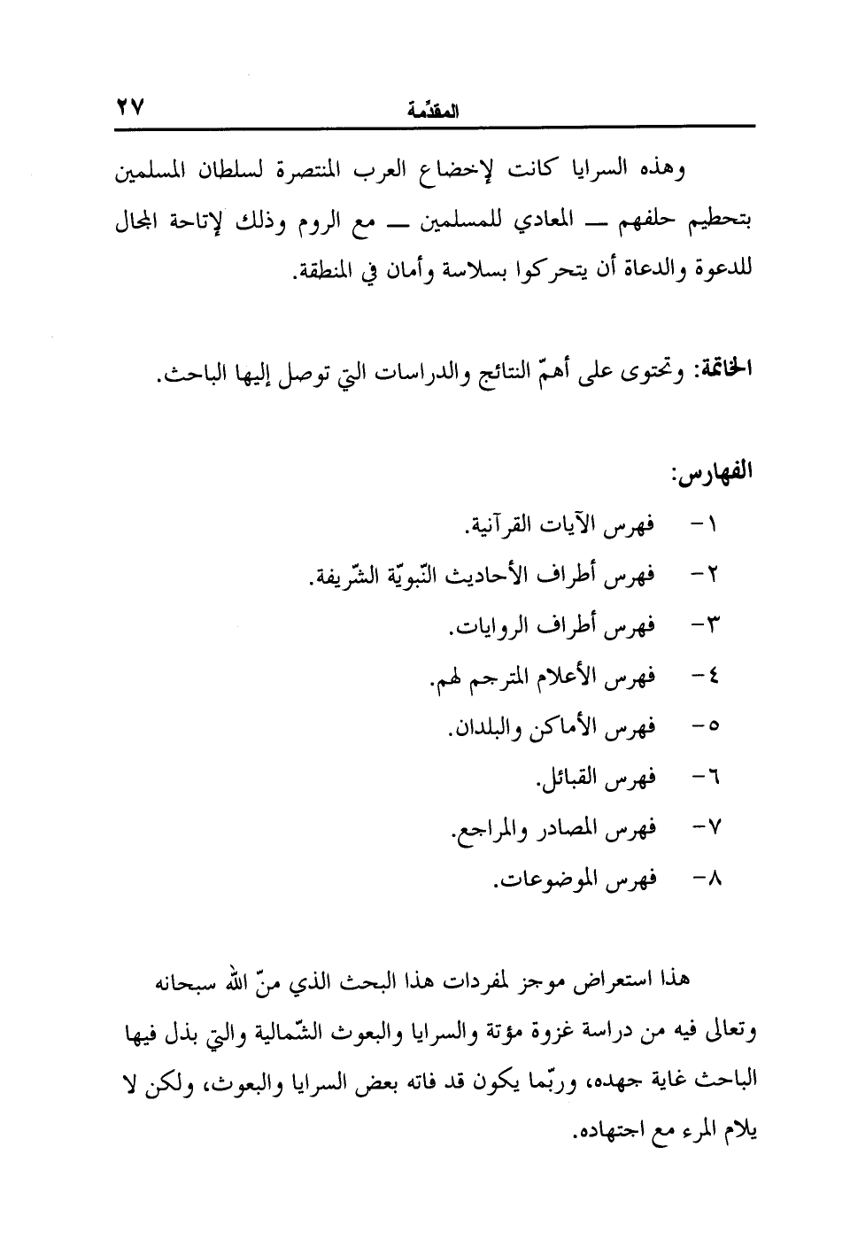 هذا استعراض موجز لمفردات هذا البحث الذي منّ الله سبحانه وتعالى فيه من دراسة غزوة مؤتة والسرايا والبعوث الشّمالية والتي بذل فيها الباحث غاية جهده، وربّما يكون قد فاته بعض السرايا والبعوث، ولكن لا يلام المرء مع اجتهاده.
