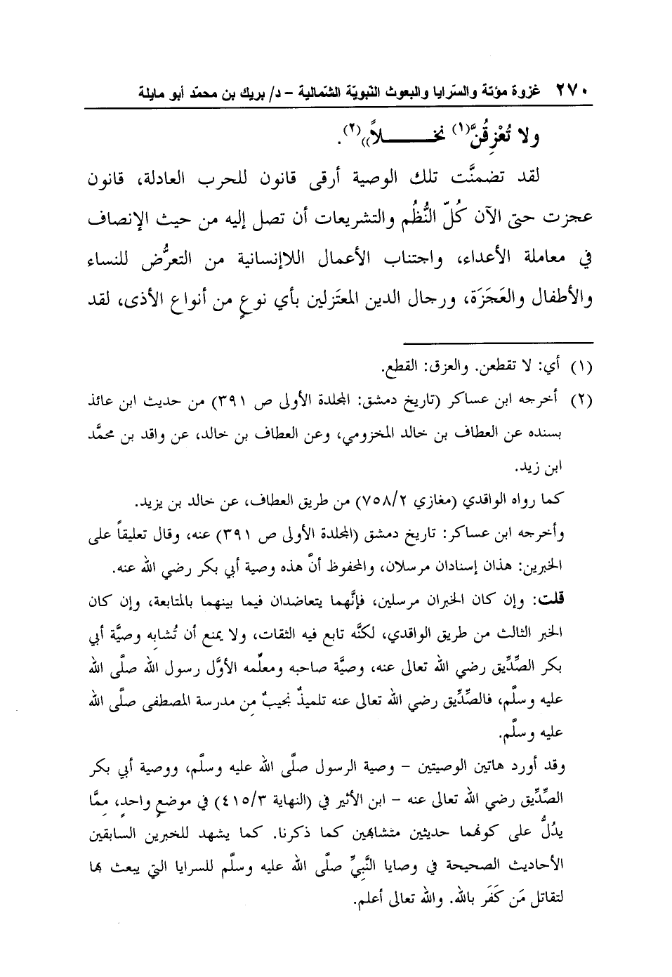 وأخرجه ابن عساكر: تاريخ دمشق (المجلدة الأولى ص 391) عنه، وقال تعليقاً على الخبرين: هذان إسنادان مرسلان، والمحفوظ أنَّ هذه وصية أبي بكر رضي الله عنه.