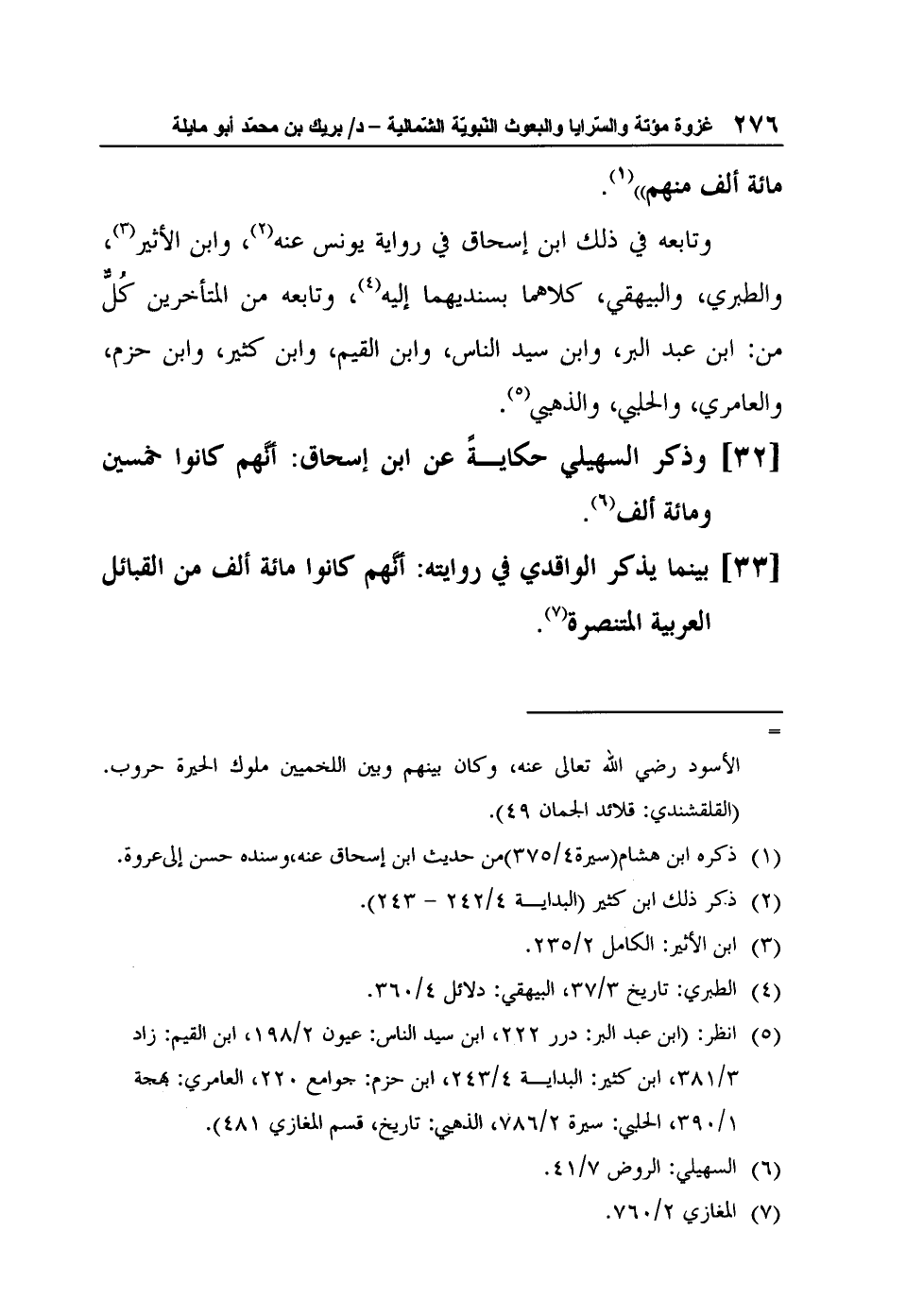 وتابعه في ذلك ابن إسحاق في رواية يونس عنه2، وابن الأثير3، والطبري، والبيهقي، كلاهما بسنديهما إليه4، وتابعه من المتأخرين كُلٌّ من: "ابن عبد البر، وابن سيد الناس، وابن القيم، وابن كثير، وابن حزم، والعامري، والحلبي، والذهبي5".