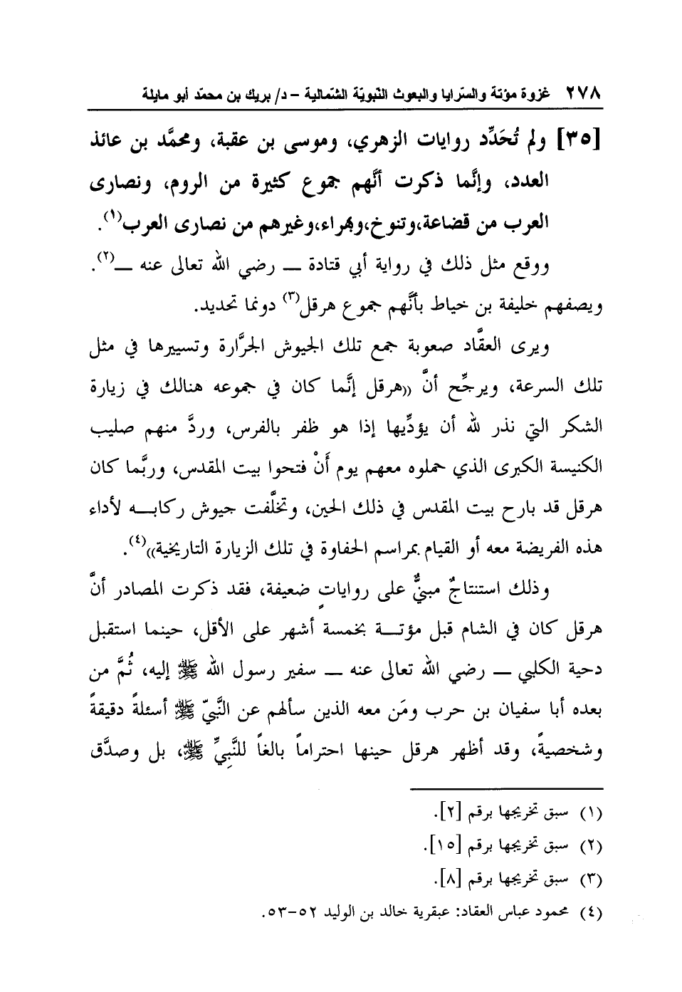 [35] ولم تُحَدِّد روايات الزهري، وموسى بن عقبة، ومحمَّد بن عائذ العدد، وإنَّما ذكرت أنَّهم جموع كثيرة من الروم، ونصارى العرب من قضاعة، وتنوخ، وبهراء، وغيرهم من نصارى العرب2".