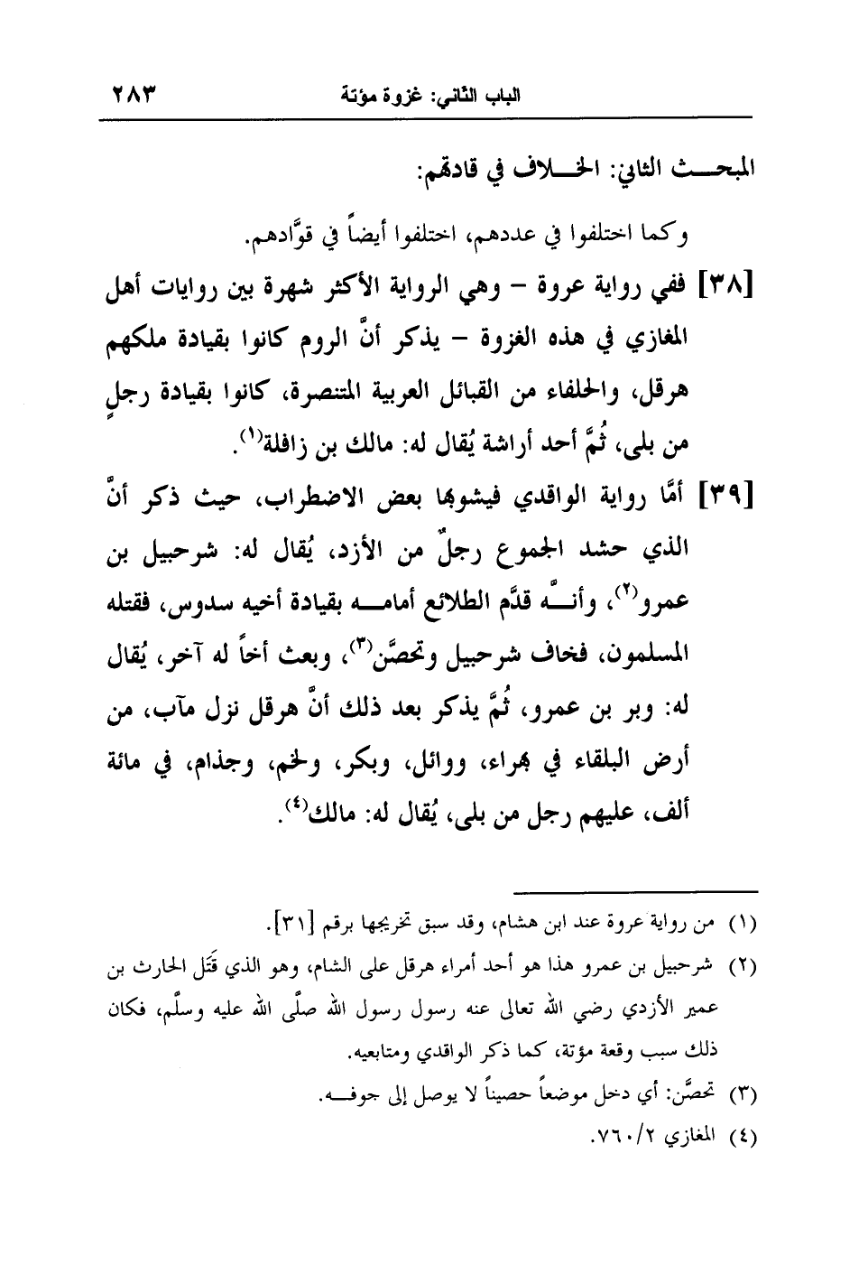 [39] أمَّا رواية الواقدي فيشوبها بعض الاضطراب، حيث ذكر أنَّ الذي حشد الجموع رجلٌ من الأزد، يُقال له: "شرحبيل بن عمرو2، وأنه قدَّم الطلائع أمامه بقيادة أخيه سدوس، فقتله المسلمون، فخاف شرحبيل وتحصَّن3، وبعث أخاً له آخر، يُقال له: "وبر بن عمرو، ثُمَّ يذكر بعد ذلك أنَّ هرقل نزل مآب، من أرض البلقاء في بهراء، ووائل، وبكر، ولخم، وجذام، في مائة ألف، عليهم رجل من بلى، يُقال له: "مالك4".